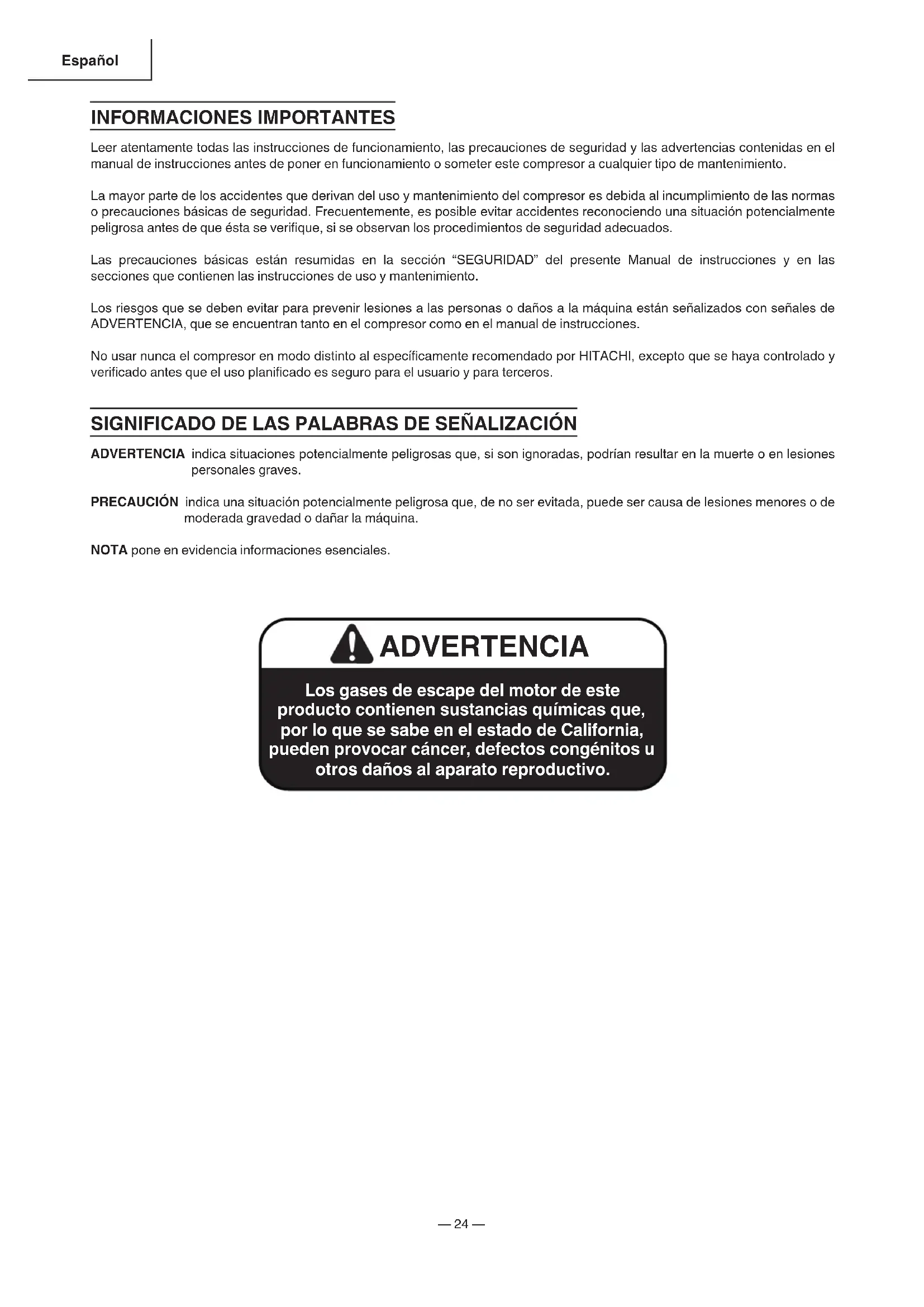 Tous les compresseurs de qualité nécessitent des interventions d’assistance ou le remplacement de pièces à cause de l’usure normale due à l’utilisation. Pour garantir que sont utilisées uniquement des pièces détachées autorisées/originales, toutes les interventions d’assistance et les réparations doivent être eff ectuées exclusivement par un CENTRE DE SERVICE APRES-VENTE AGREE HITACHI. REMARQUE: Spécifi cations sujettes à modifi cation sans préavis de la parte d’HITACHI. 000BookEC2610Elowes.indb23000BookEC2610Elowes.indb23 2018/03/0910:24:592018/03/0910:24:59Español — 24 — INFORMACIONES IMPORTANTES Leer atentamente todas las instrucciones de funcionamiento, las precauciones de seguridad y las advertencias contenidas en el manual de instrucciones antes de poner en funcionamiento o someter este compresor a cualquier tipo de mantenimiento. La mayor parte de los accidentes que derivan del uso y mantenimiento del compresor es debida al incumplimiento de las normas o precauciones básicas de seguridad. Frecuentemente, es posible evitar accidentes reconociendo una situación potencialmente peligrosa antes de que ésta se verifi que, si se observan los procedimientos de seguridad adecuados. Las precauciones básicas están resumidas en la sección “SEGURIDAD” del presente Manual de instrucciones y en las secciones que contienen las instrucciones de uso y mantenimiento. Los riesgos que se deben evitar para prevenir lesiones a las personas o daños a la máquina están señalizados con señales de ADVERTENCIA, que se encuentran tanto en el compresor como en el manual de instrucciones. No usar nunca el compresor en modo distinto al específi camente recomendado por HITACHI, excepto que se haya controlado y verifi cado antes que el uso planifi cado es seguro para el usuario y para terceros. SIGNIFICADO DE LAS PALABRAS DE SEÑALIZACIÓN ADVERTENCIA indica situaciones potencialmente peligrosas que, si son ignoradas, podrían resultar en la muerte o en lesiones personales graves. PRECAUCIÓN indica una situación potencialmente peligrosa que, de no ser evitada, puede ser causa de lesiones menores o de moderada gravedad o dañar la máquina. NOTA pone en evidencia informaciones esenciales. ADVERTENCIA Los gases de escape del motor de este producto contienen sustancias químicas que, por lo que se sabe en el estado de California, pueden provocar cáncer, defectos congénitos u otros daños al aparato reproductivo. 000BookEC2610Elowes.indb24000BookEC2610Elowes.indb24 2018/03/0910:25:002018/03/0910:25:00Español — 25 — SEGURIDAD INSTRUCCIONES IMPORTANTES DE SEGURIDAD PARA LA UTILIZACIÓN DEL COMPRESOR ADVERTENCIA: Un uso impropio o inseguro del compresor puede causar la muerte o lesiones físicas graves. Para evitar estos riegos, observar estas instrucciones básicas de seguridad: