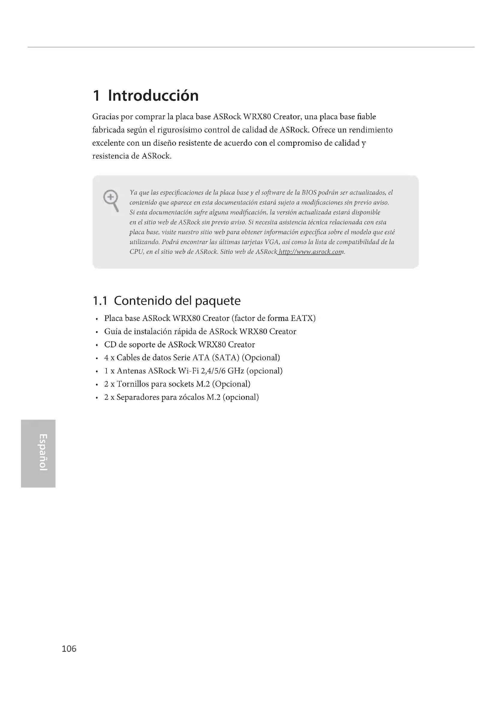 2 x Separadores para zócalos M.2 (opcional) Ya que las especicaciones de la placa base y el soware de la BIOS podrán ser actualizados, el contenido que aparece en esta documentación estará sujeto a modicaciones sin previo aviso. Si esta documentación sufre alguna modicación, la versión actualizada estará disponible en el sitio web de ASRock sin previo aviso. Si necesita asistencia técnica relacionada con esta placa base, visite nuestro sitio web para obtener información especíca sobre el modelo que esté utilizando. Podrá encontrar las últimas tarjetas VGA, así como la lista de compatibilidad de la CPU, en el sitio web de ASRock. Sitio web de ASRock http://www.asrock.com.107 WRX80 Creator Español
