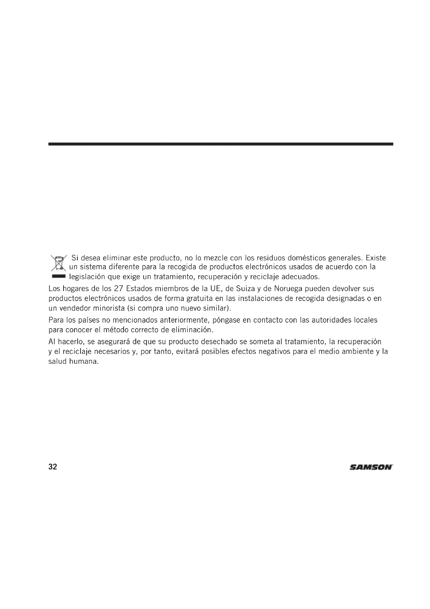 DE60x32 Si desea eliminar este producto, no lo mezcle con los residuos domésticos generales. Existe un sistema diferente para la recogida de productos electrónicos usados de acuerdo con la legislación que exige un tratamiento, recuperación y reciclaje adecuados. Los hogares de los 27 Estados miembros de la UE, de Suiza y de Noruega pueden devolver sus productos electrónicos usados de forma gratuita en las instalaciones de recogida designadas o en un vendedor minorista (si compra uno nuevo similar). Para los países no mencionados anteriormente, póngase en contacto con las autoridades locales para conocer el método correcto de eliminación. Al hacerlo, se asegurará de que su producto desechado se someta al tratamiento, la recuperación y el reciclaje necesarios y, por tanto, evitará posibles efectos negativos para el medio ambiente y la salud humana.33Micrófonos de diadema DE10x/DE50x/DE60x ENFRDEESIT Enhorabuena por su compra del micrófono de diadema Samson DEx. El DE10x y el DE50x cuentan con un patrón de captación omnidireccional que ofrece una respuesta de frecuencia lineal fuera del eje, lo que da como resultado un sonido claro y articulado perfecto para aplicaciones de difusión, culto, presentación, teatro y fitness. El DE60x tiene un patrón de captación unidireccional, que proporciona un magnífico aislamiento, lo que se traduce en una mayor ganancia antes de la retroalimentación con un sonido claro y articulado en aplicaciones de sonido en directo. Los micrófonos de diadema DEx iincluyen cuatro cables adaptadores desmontables: 1/8" [3,5mm], Hirose® 4-pines, Switchcraft® TA3F, Switchcraft® TA4F para la compatibilidad con los productos Samson inalámbricos así como con los transmisores inalámbricos más populares. El pack incluye cuatro paravientos, un clip para el cuello y una funda protectora de transporte. Los micrófonos DEx tienen conectores chapados en oro, revestimiento resistente a la humedad y rejilla de malla de acero inoxidable. Son resistentes al agua/el sudor con una clasificación IP65. Además, hay un anillo de protección contra la humedad para proteger aún más la cápsula y garantizar un rendimiento fiable. Si tiene alguna pregunta o comentario sobre el micrófono de diadema DEx o cualquier otro producto de Samson, no dude en ponerse en contacto con nosotros en support@samsontech.com. Introducción34 Los auriculares pueden cambiar de tamaño al deslizar los ganchos de las orejas para que se ajusten bien a su cabeza. Si el auricular está flojo y no se mantiene en su sitio, deslice los cables del gancho de la oreja hacia atrás para que quede más ajustado. Ajuste la posición del micrófono al sujetar el cable del gancho de la oreja izquierda y deslice el brazo hacia delante o hacia atrás. Para obtener un rendimiento óptimo, el micrófono debe estar cerca de la piel y hacia la comisura de la boca, aproximadamente a media pulgada de distancia. Coloque el anillo de protección contra la humedad lo más cerca posible de la cápsula. Para el uso en exteriores y para ayudar a reducir el petardeo, instale uno de los paravientos incluidos. Cómo colocar el micrófono DE10x/50x/60x35Micrófonos de diadema DE10x/DE50x/DE60x ENFRDEESIT Cables de conexión Los DE10x/DE50x/DE60x incluyen cuatro cables con adaptadores para algunos de los transmisores de cuerpo de micrófono inalámbricos más populares. Conector de 3,5mm Funciona con los sistemas inalámbricos Sennheiser