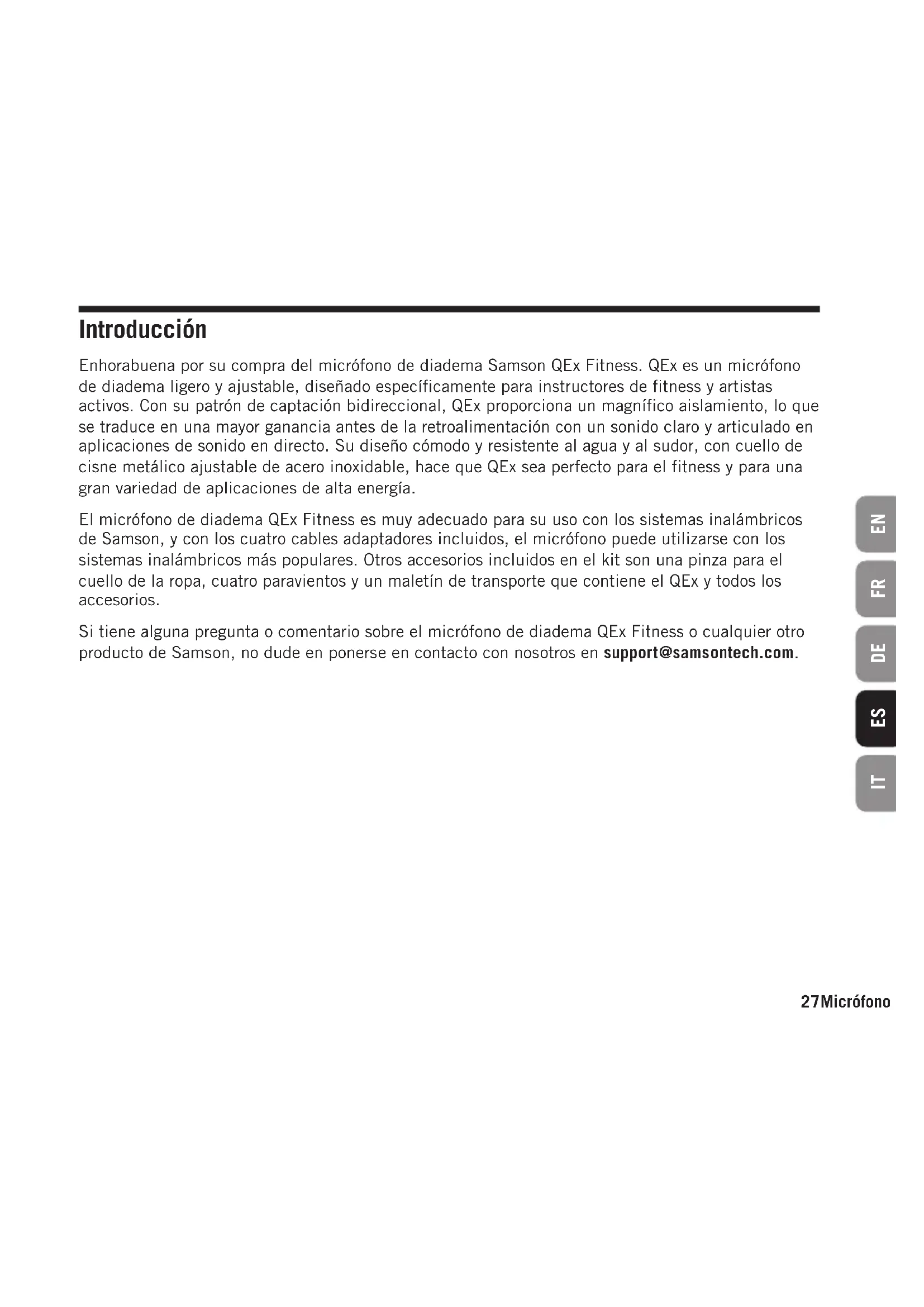 027Micrófono de diadema QEx Fitness ENFRDEESIT Enhorabuena por su compra del micrófono de diadema Samson QEx Fitness. QEx es un micrófono de diadema ligero y ajustable, diseñado específicamente para instructores de fitness y artistas activos. Con su patrón de captación bidireccional, QEx proporciona un magnífico aislamiento, lo que se traduce en una mayor ganancia antes de la retroalimentación con un sonido claro y articulado en aplicaciones de sonido en directo. Su diseño cómodo y resistente al agua y al sudor, con cuello de cisne metálico ajustable de acero inoxidable, hace que QEx sea perfecto para el fitness y para una gran variedad de aplicaciones de alta energía. El micrófono de diadema QEx Fitness es muy adecuado para su uso con los sistemas inalámbricos de Samson, y con los cuatro cables adaptadores incluidos, el micrófono puede utilizarse con los sistemas inalámbricos más populares. Otros accesorios incluidos en el kit son una pinza para el cuello de la ropa, cuatro paravientos y un maletín de transporte que contiene el QEx y todos los accesorios. Si tiene alguna pregunta o comentario sobre el micrófono de diadema QEx Fitness o cualquier otro producto de Samson, no dude en ponerse en contacto con nosotros en support@samsontech.com. Introducción28 Para mayor comodidad y ajuste, el auricular QEx incluye una diadema ajustable. Para colocar la diadema, tire de la cinta elástica por encima de los ganchos de la oreja y sitúela delante del punto de tope (A). Para un tamaño mayor, la banda de la cabeza puede desplazarse por detrás del punto de parada (B) o retirarse por completo deslizando la banda elástica sobre los ganchos de la oreja y la cápsula del micrófono. Nota: Cuando retire la diadema, quite primero el paravientos del micrófono. Cómo colocar el micrófono QEx29Micrófono de diadema QEx Fitness ENFRDEESIT Cables de conexión QEx incluye cuatro cables con adaptadores para algunos de los transmisores de petaca para micrófonos inalámbricos más populares. Conector de 3,5mm Funciona con los sistemas inalámbricos Sennheiser