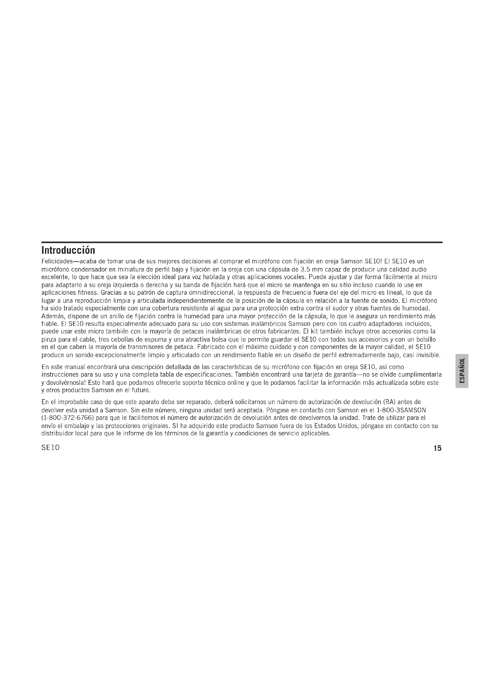 ESPAÑOL Introducción Felicidades—acaba de tomar una de sus mejores decisiones al comprar el micrófono con fijación en oreja Samson SE10! El SE10 es un micrófono condensador en miniatura de perfil bajo y fijación en la oreja con una cápsula de 3.5 mm capaz de producir una calidad audio excelente, lo que hace que sea la elección ideal para voz hablada y otras aplicaciones vocales. Puede ajustar y dar forma fácilmente al micro para adaptarlo a su oreja izquierda o derecha y su banda de fijación hará que el micro se mantenga en su sitio incluso cuando lo use en aplicaciones fitness. Gracias a su patrón de captura omnidireccional, la respuesta de frecuencia fuera del eje del micro es lineal, lo que da lugar a una reproducción limpia y articulada independientemente de la posición de la cápsula en relación a la fuente de sonido. El micrófono ha sido tratado especialmente con una cobertura resistente al agua para una protección extra contra el sudor y otras fuentes de humedad. Además, dispone de un anillo de fijación contra la humedad para una mayor protección de la cápsula, lo que le asegura un rendimiento más fiable. El SE10 resulta especialmente adecuado para su uso con sistemas inalámbricos Samson pero con los cuatro adaptadores incluidos, puede usar este micro también con la mayoría de petacas inalámbricas de otros fabricantes. El kit también incluye otros accesorios como la pinza para el cable, tres cebollas de espuma y una atractiva bolsa que le permite guardar el SE10 con todos sus accesorios y con un bolsillo en el que caben la mayoría de transmisores de petaca. Fabricado con el máximo cuidado y con componentes de la mayor calidad, el SE10 produce un sonido excepcionalmente limpio y articulado con un rendimiento fiable en un diseño de perfil extremadamente bajo, casi invisible. En este manual encontrará una descripción detallada de las características de su micrófono con fijación en oreja SE10, así como instrucciones para su uso y una completa tabla de especificaciones. También encontrará una tarjeta de garantía—no se olvide cumplimentarla y devolvérnosla! Esto hará que podamos ofrecerle soporte técnico online y que le podamos facilitar la información más actualizada sobre este y otros productos Samson en el futuro. En el improbable caso de que este aparato deba ser reparado, deberá solicitarnos un número de autorización de devolución (RA) antes de devolver esta unidad a Samson. Sin este número, ninguna unidad será aceptada. Póngase en contacto con Samson en el 1-800-3SAMSON (1-800-372-6766) para que le facilitemos el número de autorización de devolución antes de devolvernos la unidad. Trate de utilizar para el envío el embalaje y las protecciones originales. SI ha adquirido este producto Samson fuera de los Estados Unidos, póngase en contacto con su distribuidor local para que le informe de los términos de la garantía y condiciones de servicio aplicables.16 Características del SE10 El micrófono omnidireccional con fijación de oreja SE10 le ofrece una reproducción vocal excelente con un diseño de perfil bajo y casi invisible. Aquí puede ver sus características principales: