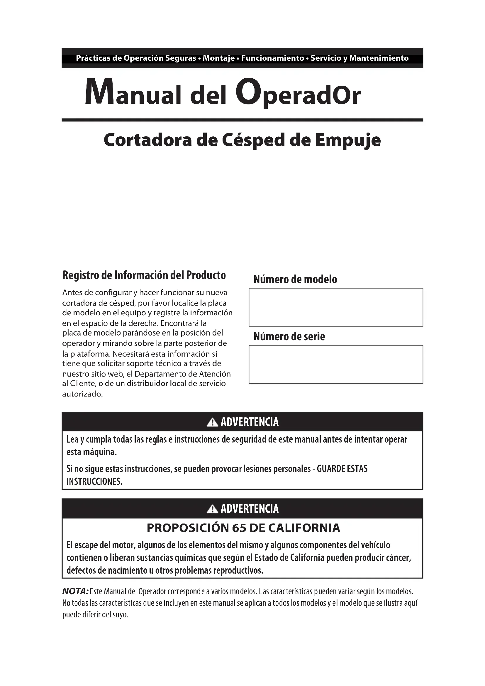 (Figure 24).NOTA: Este Manual del Operador corresponde a varios modelos. Las características pueden variar según los modelos. No todas las características que se incluyen en este manual se aplican a todos los modelos y el modelo que se ilustra aquí puede diferir del suyo. Manual del OperadOr Prácticas de Operación Seguras • Montaje • Funcionamiento • Servicio y Mantenimiento Cortadora de Césped de Empuje ADVERTENCIA Lea y cumpla todas las reglas e instrucciones de seguridad de este manual antes de intentar operar esta máquina. Si no sigue estas instrucciones, se pueden provocar lesiones personales - GUARDE ESTAS INSTRUCCIONES. ADVERTENCIA