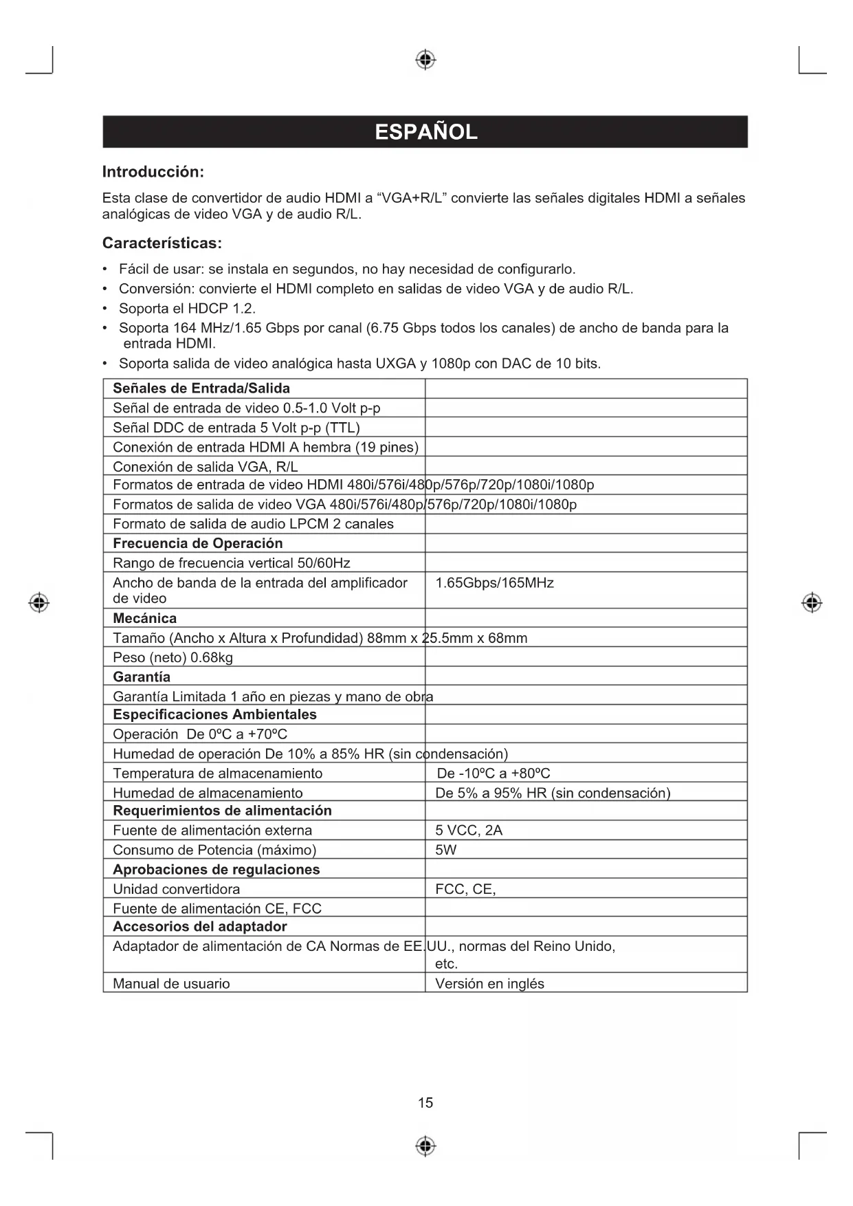 NON APRIRE ATTENZIONE15 ESPAÑOL Introducción: Esta clase de convertidor de audio HDMI a “VGA+R/L” convierte las señales digitales HDMI a señales analógicas de video VGA y de audio R/L. Características: