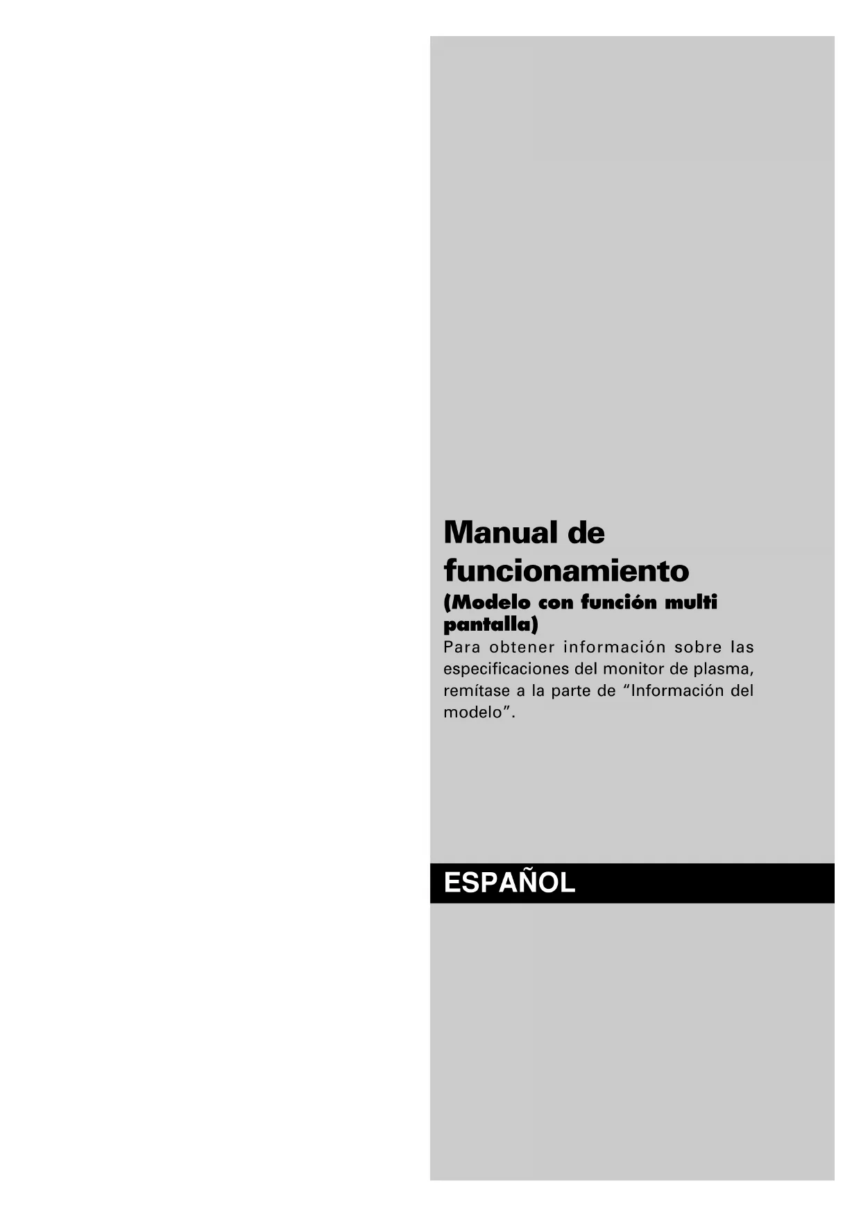 QUITAR LA TAPA. DENTRO DE LA UNIDAD NO HAY PIEZAS QUE PUEDAN SER REPA-RADAS POR EL USUARIO. REMITIR LA ASISTENCIA TÉCNICA SÓLO A PER- SONAL TÉCNICO CUALIFICADO. Este símbolo advierte al usuario que la tensión sin aislar dentro de la unidad puede ser lo suficientemente alta como para producir descargas eléctricas. Por lo tanto, es peligroso cualquier tipo de contacto con las piezas que se encuentran dentro de la unidad. Este símbolo advierte al usuario de la inclusión de literatura importante concerniente al funcionamiento y mantenimiento de la unidad. Por lo tanto, debe leerse atentamente con el objeto de evitar cualquier tipo de problemas. ADVERTENCIA PARA EVITAR INCENDIOS Y PELIGROS DE DESCARGA ELÉCTRICA, NO SE DEBE EXPONER LA UNIDAD A LA LLUVIA NI A LA HUMEDAD. ADEMÁS, NO DEBE UTILIZARSE LA TOMA POLARIZADA DE ALIMENTACIÓN DE LA UNIDAD CON CABLES ALARGADORES U OTRAS TOMAS, A MENOS QUE LAS PUNTAS DE LOS ENCHUFES PUEDAN INTRODUCIRSE A FONDO. ABSTENERSE DE ABRIR EL APARATO YA QUE HAY COMPONENTES DE ALTA TENSIÓN DENTRO DE ÉL. REMITIR LA ASISTENCIA TÉCNICA A PERSONAL DE SERVICIO TÉCNICO CUALIFICADO. Advertencias y Precauciones de Seguridad Este monitor de plasma ha sido diseñado y fabricado con la idea de un servicio largo en el tiempo y libre de problemas de asistencia técnica. Consulte la sección “Procedimiento de limpieza del monitor de plasma”. El panel de visualización de plasma consiste en elementos de una imagen fina (células). Con más de un 99,99 por ciento de células activas. Puede que algunas células no produzcan luz o no se mantengan encendidas. Para que el funcionamiento sea seguro y también, para evitar daños a la unidad, rogamos leer y observar atentamente las siguientes instrucciones. Para evitar riesgos de golpes e incendios: