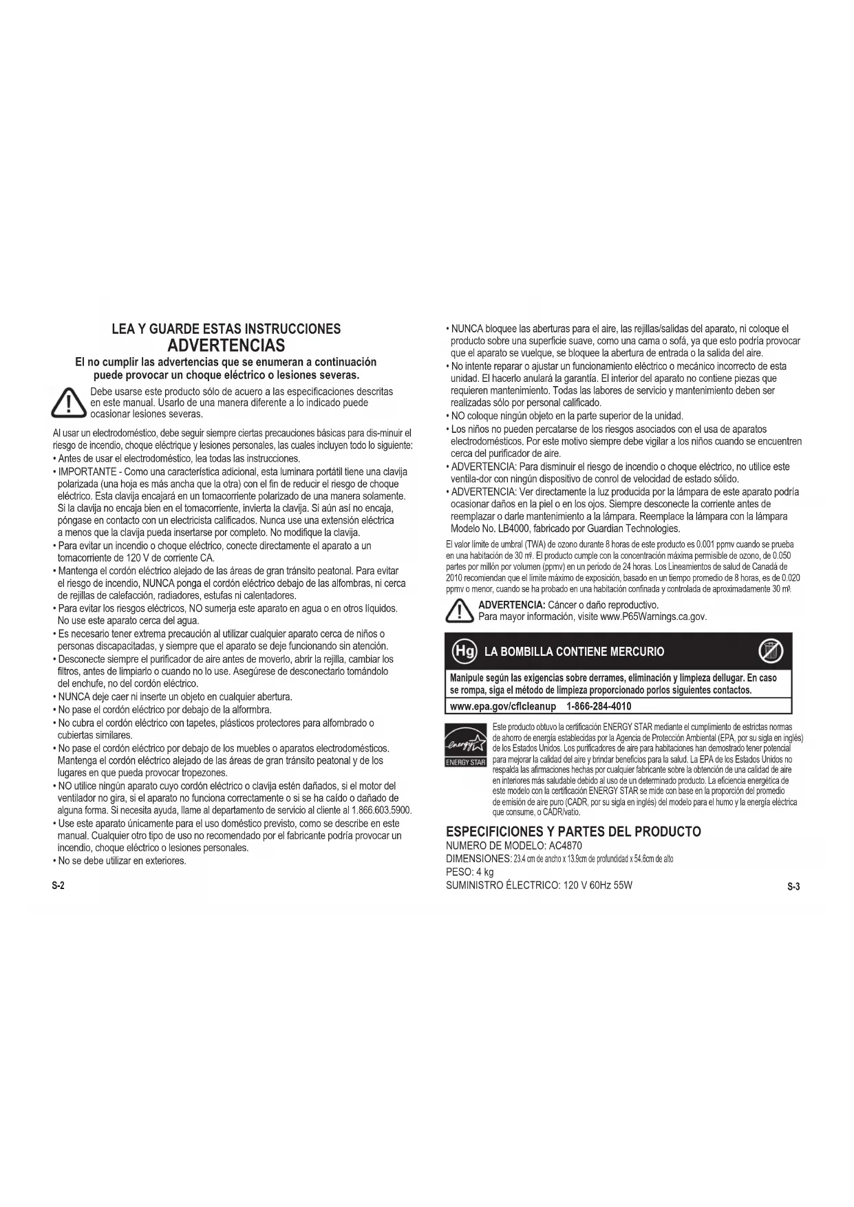 - ADVERTENCIA: Ver directamente la luz producida por la lámpara de este aparato podría ocasionar daños en la piel o en los ojos. Siempre desconecte la corriente antes de reemplazar o darle mantenimiento a la lámpara. Reemplace la lámpara con la lámpara Modelo No. LB4000, fabricado por Guardian Technologies. S-3 El valor límite de umbral (TWA) de ozono durante 8 horas de este producto es 0.001 ppmv cuando se prueba en una habitación de 30 m