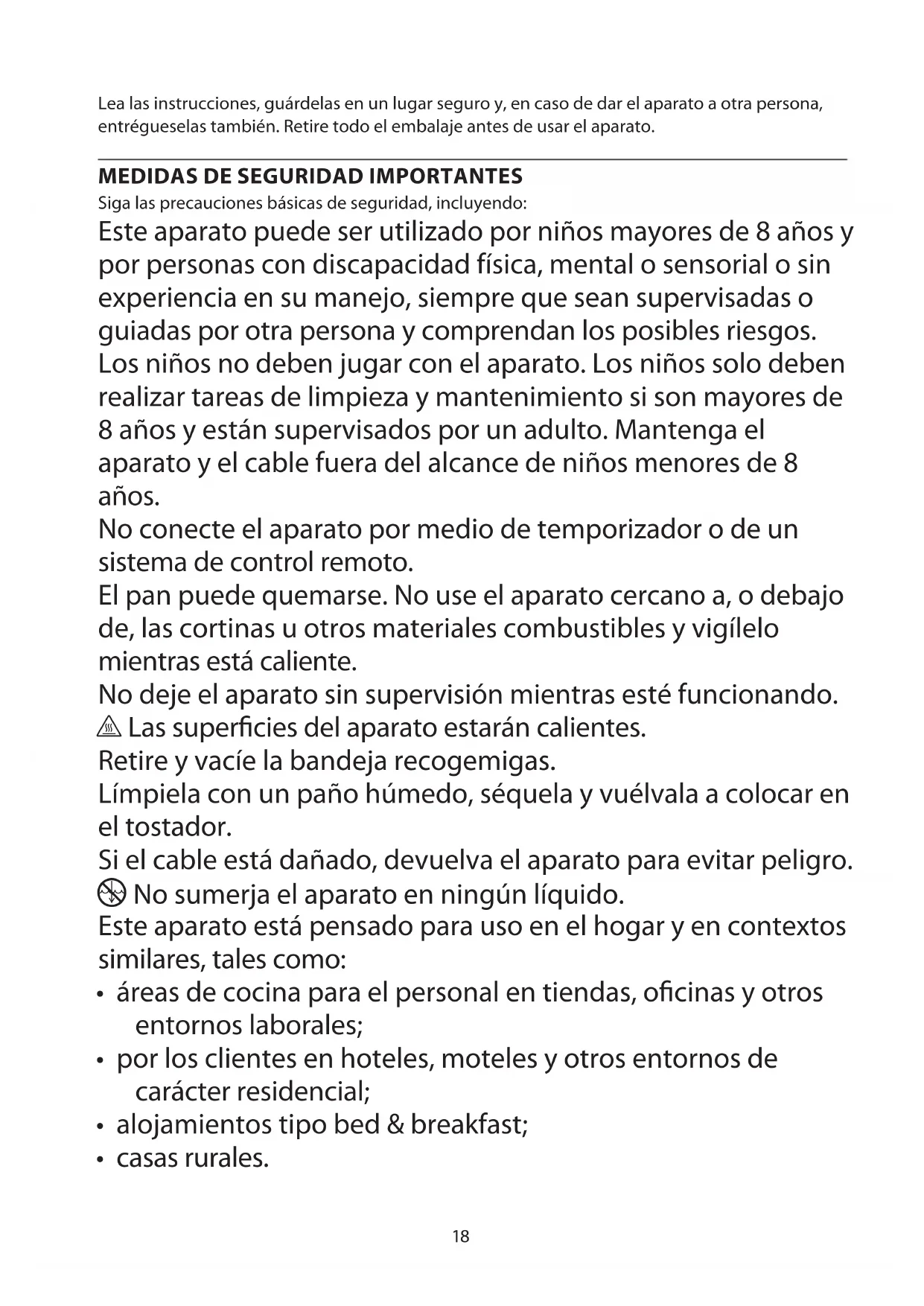 Siga las precauciones básicas de seguridad, incluyendo: Este aparato puede ser utilizado por niños mayores de 8 años y por personas con discapacidad física, mental o sensorial o sin experiencia en su manejo, siempre que sean supervisadas o guiadas por otra persona y comprendan los posibles riesgos. Los niños no deben jugar con el aparato. Los niños solo deben realizar tareas de limpieza y mantenimiento si son mayores de 8 años y están supervisados por un adulto. Mantenga el aparato y el cable fuera del alcance de niños menores de 8 años. No conecte el aparato por medio de temporizador o de un sistema de control remoto. El pan puede quemarse. No use el aparato cercano a, o debajo de, las cortinas u otros materiales combustibles y vigílelo mientras está caliente. No deje el aparato sin supervisión mientras esté funcionando. h Las superficies del aparato estarán calientes. Retire y vacíe la bandeja recogemigas. Límpiela con un paño húmedo, séquela y vuélvala a colocar en el tostador. Si el cable está dañado, devuelva el aparato para evitar peligro. i No sumerja el aparato en ningún líquido. Este aparato está pensado para uso en el hogar y en contextos similares, tales como: