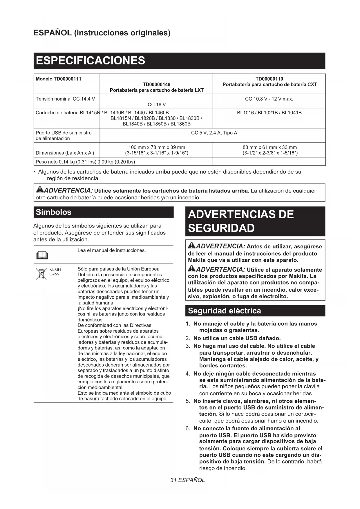 - Algunos de los cartuchos de batería indicados arriba puede que no estén disponibles dependiendo de su región de residencia. ADVERTENCIA: Utilice solamente los cartuchos de batería listados arriba. La utilización de cualquier otro cartucho de batería puede ocasionar heridas y/o un incendio. Símbolos Algunos de los símbolos siguientes se utilizan para el producto. Asegúrese de entender sus signicados antes de la utilización. Lea el manual de instrucciones. Ni-MH Li-ion Sólo para países de la Unión Europea Debido a la presencia de componentes peligrosos en el equipo, el equipo eléctrico y electrónico, los acumuladores y las baterías desechados pueden tener un impacto negativo para el medioambiente y la salud humana. ¡No tire los aparatos eléctricos y electróni- cos ni las baterías junto con los residuos domésticos! De conformidad con las Directivas Europeas sobre residuos de aparatos eléctricos y electrónicos y sobre acumu- ladores y baterías y residuos de acumula- dores y baterías, así como la adaptación de las mismas a la ley nacional, el equipo eléctrico, las baterías y los acumuladores desechados deberán ser almacenados por separado y trasladados a un punto distinto de recogida de desechos municipales, que cumpla con los reglamentos sobre protec- ción medioambiental. Esto se indica mediante el símbolo de cubo de basura tachado colocado en el equipo. ADVERTENCIAS DE SEGURIDAD ADVERTENCIA: Antes de utilizar, asegúrese de leer el manual de instrucciones del producto Makita que va a utilizar con este aparato. ADVERTENCIA: Utilice el aparato solamente con los productos especicados por Makita. La utilización del aparato con productos no compa- tibles puede resultar en un incendio, calor exce- sivo, explosión, o fuga de electrolito. Seguridad eléctrica