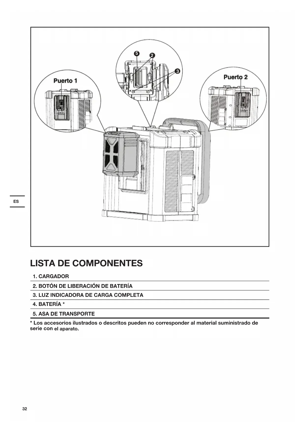 Fusible Terminal positivo Terminal negativo Los residuos de aparatos eléctricos y electrónicos no deben depositarse en la basura doméstica. Se deben reciclar en las instalaciones especializadas. Consulte a las autoridades locales o el establecimiento para saber cómo reciclar estos productos. PROCEDIMIENTO DE CARGA NOTA: Antes de usar la herramienta lea el manual de instrucciones detenidamente. ADVERTENCIA -Considerando la capacidad de corriente, utilice la línea específica para evitar una sobrecarga de la fuente de alimentación.