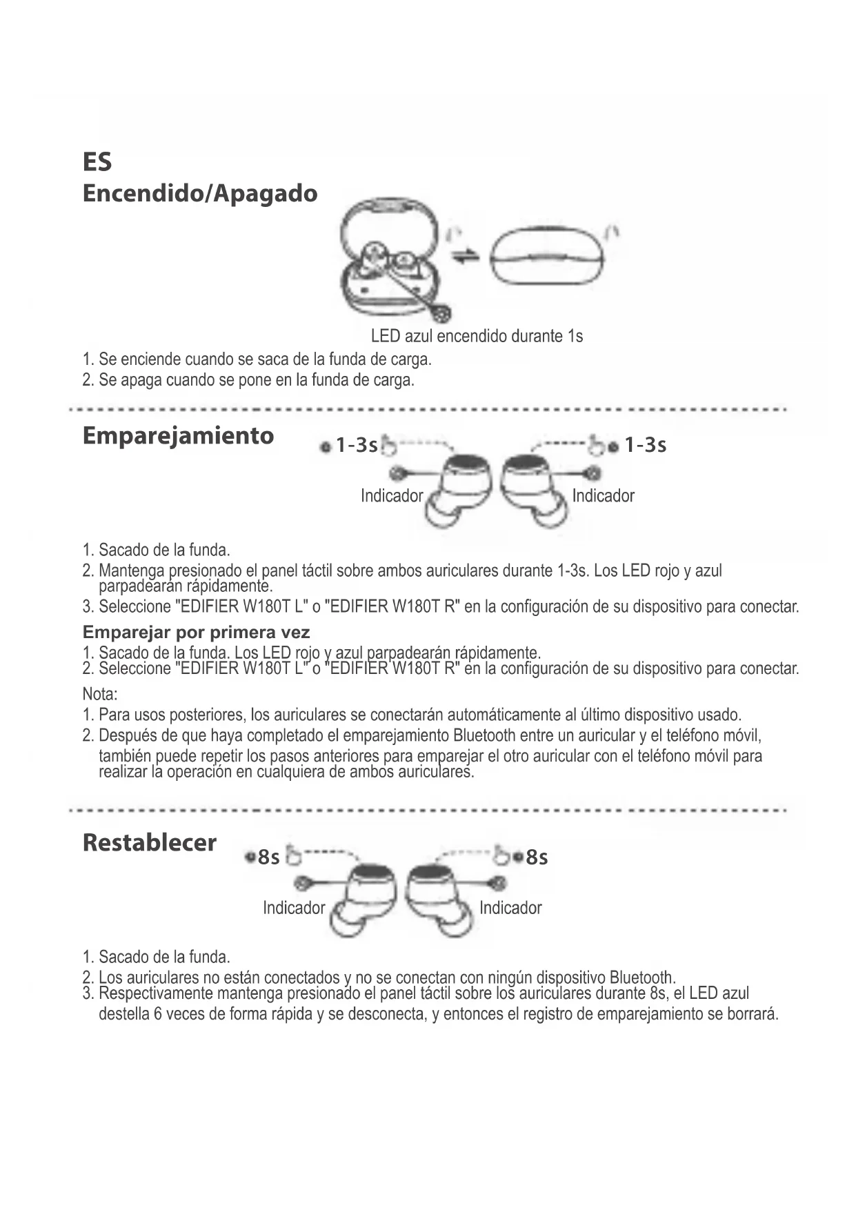 Restablecer 1. Sacado de la funda.2. Los auriculares no están conectados y no se conectan con ningún dispositivo Bluetooth.3. Respectivamente mantenga presionado el panel táctil sobre los auriculares durante 8s, el LED azul destella 6 veces de forma rápida y se desconecta, y entonces el registro de emparejamiento se borrará. LED azul encendido durante 1sx2