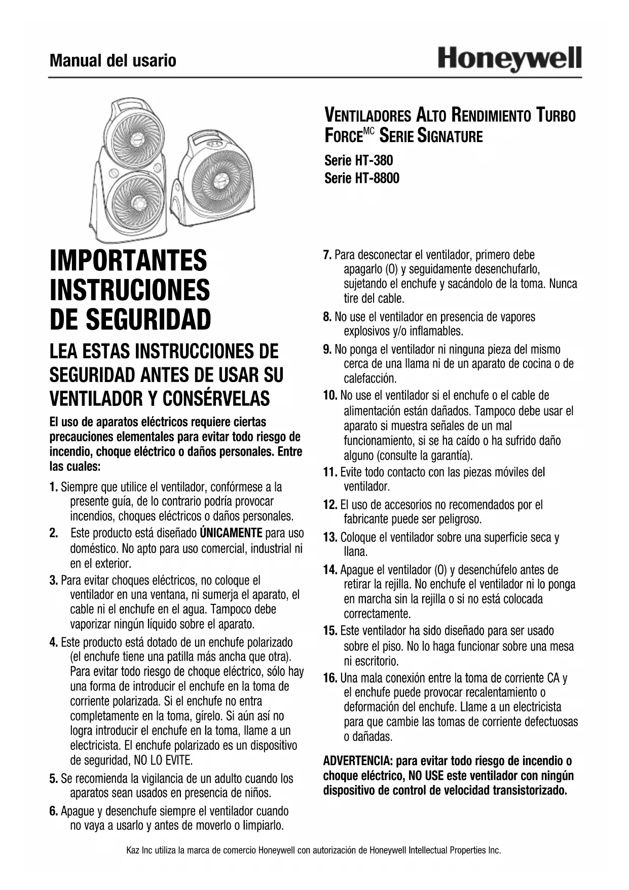 SERIE SIGNATURE Serie HT-380 Serie HT-8800 Kaz Inc utiliza la marca de comercio Honeywell con autorización de Honeywell Intellectual Properties Inc. IMPORTANTES INSTRUCIONES DE SEGURIDAD