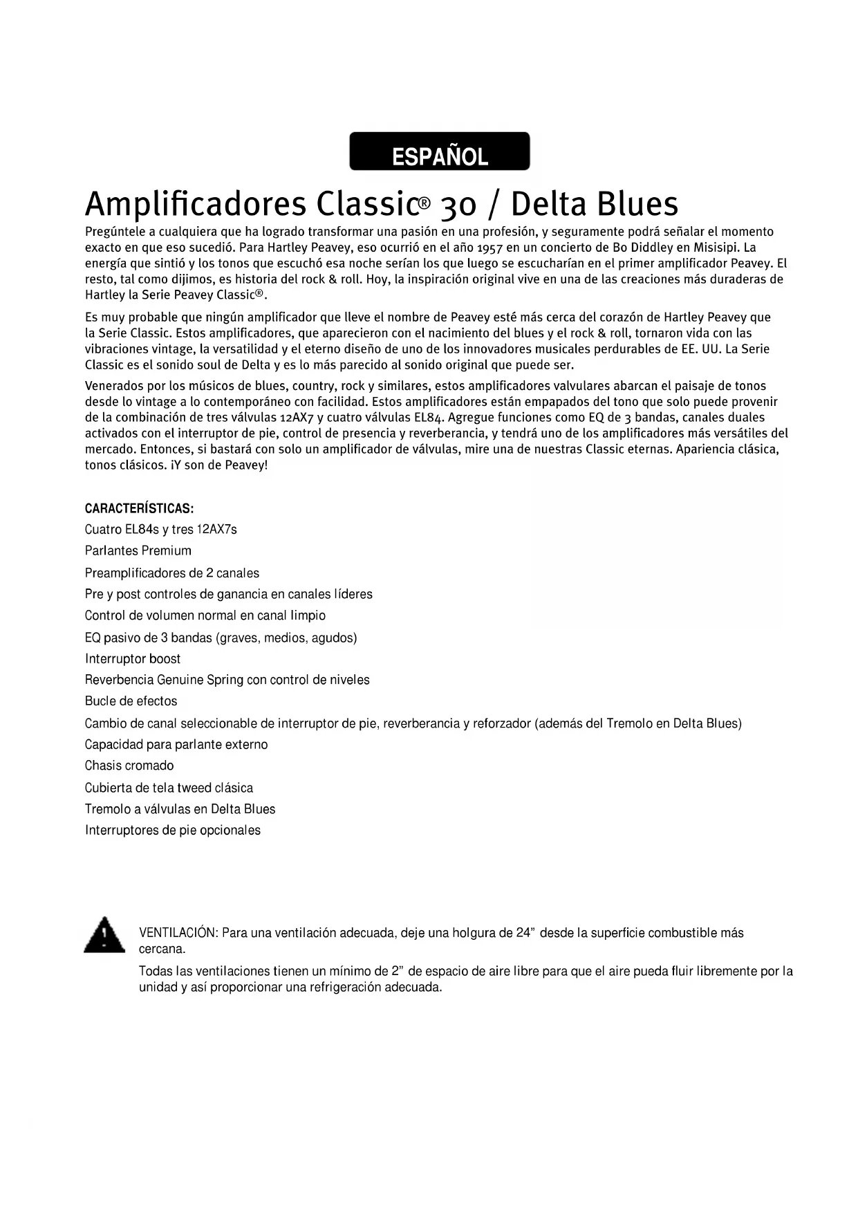 Es muy probable que ningún amplificador que lleve el nombre de Peavey esté más cerca del corazón de Hartley Peavey que la Serie Classic. Estos amplificadores, que aparecieron con el nacimiento del blues y el rock & roll, tornaron vida con las vibraciones vintage, la versatilidad y el eterno diseño de uno de los innovadores musicales perdurables de EE. UU. La Serie Classic es el sonido soul de Delta y es lo más parecido al sonido original que puede ser. Venerados por los músicos de blues, country, rock y similares, estos amplificadores valvulares abarcan el paisaje de tonos desde lo vintage a lo contemporáneo con facilidad. Estos amplificadores están empapados del tono que solo puede provenir de la combinación de tres válvulas 12AX7 y cuatro válvulas EL84. Agregue funciones como EQ de 3 bandas, canales duales activados con el interruptor de pie, control de presencia y reverberancia, y tendrá uno de los amplificadores más versátiles del mercado. Entonces, si bastará con solo un amplificador de válvulas, mire una de nuestras Classic eternas. Apariencia clásica, tonos clásicos. ¡Y son de Peavey! CARACTERÍSTICAS: Cuatro EL84s y tres 12AX7s Parlantes Premium Preamplificadores de 2 canales Pre y post controles de ganancia en canales líderes Control de volumen normal en canal limpio EQ pasivo de 3 bandas (graves, medios, agudos) Interruptor boost Reverbencia Genuine Spring con control de niveles Bucle de efectos Cambio de canal seleccionable de interruptor de pie, reverberancia y reforzador (además del Tremolo en Delta Blues) Capacidad para parlante externo Chasis cromado Cubierta de tela tweed clásica Tremolo a válvulas en Delta Blues Interruptores de pie opcionales ESPAÑOL VENTILACIÓN: Para una ventilación adecuada, deje una holgura de 24” desde la superficie combustible más cercana. Todas las ventilaciones tienen un mínimo de 2” de espacio de aire libre para que el aire pueda fluir libremente por la unidad y así proporcionar una refrigeración adecuada.Classic