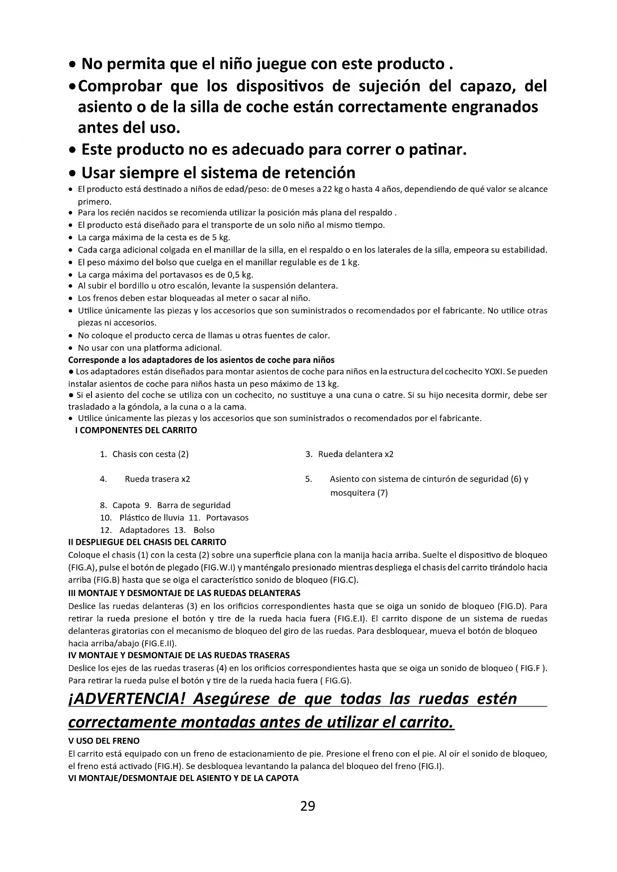 ESTIMADO CLIENTE! Gracias por comprar el producto de marca Kinderkraft. Nuestros productos han sido diseñados para la seguridad y comodidad de su hijo. La silla es ideal para aquellos que aprecian la calidad, modernidad y funcionalidad. Por favor lea este manual y cumpla las recomendaciones. Importante – Leer detenidamente y mantenerlas para futuras consultas ¡ADVERTENCIA! No dejar nunca al niño desatendido. Asegurarse de que todos los dispositivos de cierre están engranados antes del uso. Para evitar lesiones, asegúrese de que el niño se mantiene alejado durante el desplegado y el plegado de este producto. ES29 No permita que el niño juegue con este producto . Comprobar que los dispositivos de sujeción del capazo, del asiento o de la silla de coche están correctamente engranados antes del uso. Este producto no es adecuado para correr o patinar. Usar siempre el sistema de retención El producto está destinado a niños de edad/peso: de 0 meses a 22 kg o hasta 4 años, dependiendo de qué valor se alcance primero. Para los recién nacidos se recomienda utilizar la posición más plana del respaldo . El producto está diseñado para el transporte de un solo niño al mismo tiempo. La carga máxima de la cesta es de 5 kg. Cada carga adicional colgada en el manillar de la silla, en el respaldo o en los laterales de la silla, empeora su estabilidad. El peso máximo del bolso que cuelga en el manillar regulable es de 1 kg. La carga máxima del portavasos es de 0,5 kg. Al subir el bordillo u otro escalón, levante la suspensión delantera. Los frenos deben estar bloqueadas al meter o sacar al niño. Utilice únicamente las piezas y los accesorios que son suministrados o recomendados por el fabricante. No utilice otras piezas ni accesorios. No coloque el producto cerca de llamas u otras fuentes de calor. No usar con una platforma adicional. Corresponde a los adaptadores de los asientos de coche para niños ● Los adaptadores están diseñados para montar asientos de coche para niños en la estructura del cochecito YOXI. Se pueden instalar asientos de coche para niños hasta un peso máximo de 13 kg. ● Si el asiento del coche se uliza con un cochecito, no sustuye a una cuna o catre. Si su hijo necesita dormir, debe ser trasladado a la góndola, a la cuna o a la cama. Utilice únicamente las piezas y los accesorios que son suministrados o recomendados por el fabricante.