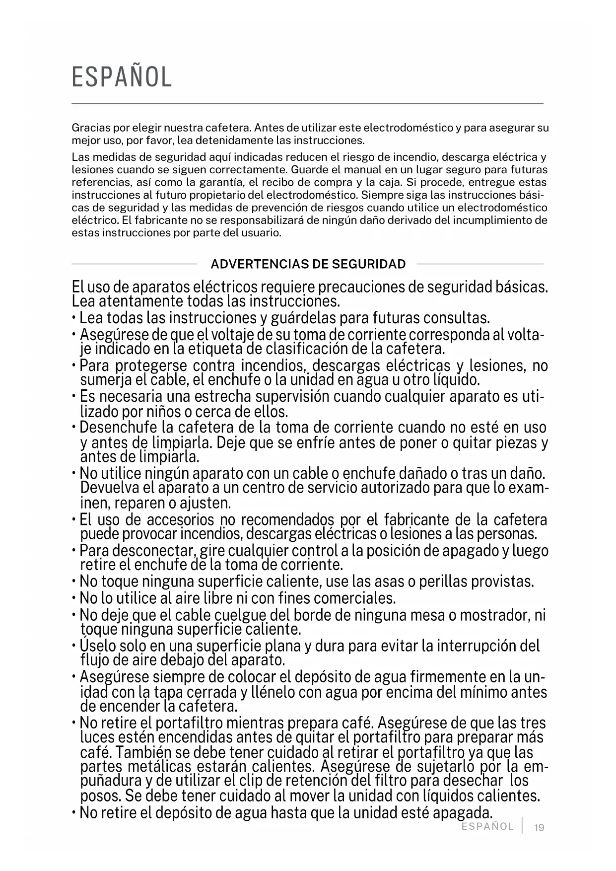 The three control panel lights are flas- hing alternatively. Water tank is out of water. Add water to tank.19 ESPAÑOL Gracias por elegir nuestra cafetera. Antes de utilizar este electrodoméstico y para asegurar su mejor uso, por favor, lea detenidamente las instrucciones. Las medidas de seguridad aquí indicadas reducen el riesgo de incendio, descarga eléctrica y lesiones cuando se siguen correctamente. Guarde el manual en un lugar seguro para futuras referencias, así como la garantía, el recibo de compra y la caja. Si procede, entregue estas instrucciones al futuro propietario del electrodoméstico. Siempre siga las instrucciones bási- cas de seguridad y las medidas de prevención de riesgos cuando utilice un electrodoméstico eléctrico. El fabricante no se responsabilizará de ningún daño derivado del incumplimiento de estas instrucciones por parte del usuario.