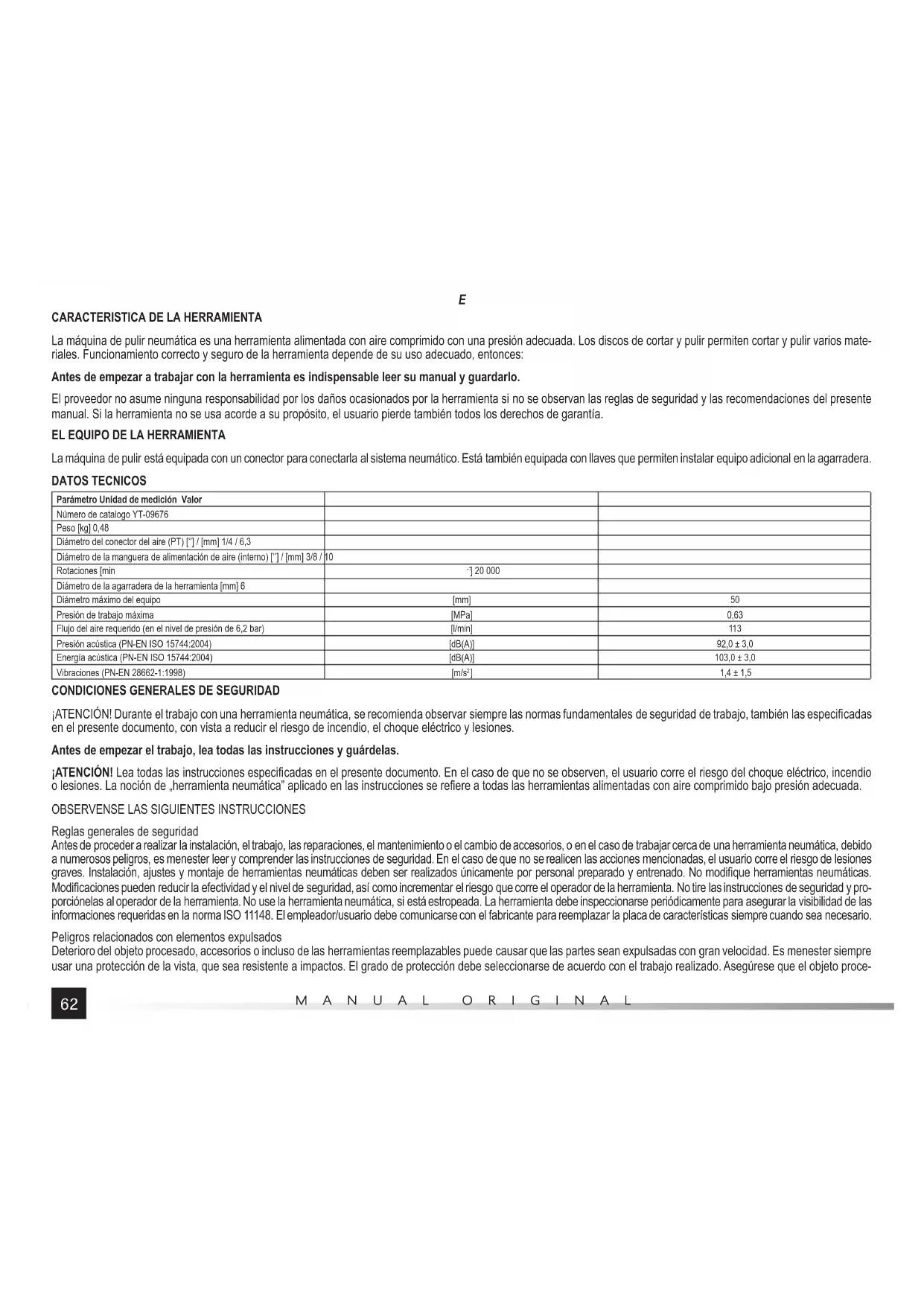 La máquina de pulir está equipada con un conector para conectarla al sistema neumático. Está también equipada con llaves que permiten instalar equipo adicional en la agarradera. DATOS TECNICOS Parámetro Unidad de medición Valor Número de catalogo YT-09676 Peso [kg] 0,48 Diámetro del conector del aire (PT) [‘’] / [mm] 1/4 / 6,3 Diámetro de la manguera de alimentación de aire (interno) [‘’] / [mm] 3/8 / 10 Rotaciones [min