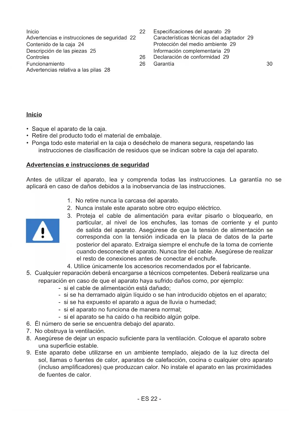 sol, llamas o fuentes de calor, aparatos de calefacción, cocina o cualquier otro aparato (incluso amplicadores) que produzcan calor. No inale el aparato en las proximidades de fuentes de calor. Inicio 22 Advertencias e instrucciones de seguridad 22 Contenido de la caja 24 Descripción de las piezas 25 Controles 26 Funcionamiento 26 Advertencias relativa a las pilas 28 Especicaciones del aparato 29 Características técnicas del adaptador 29 Protección del medio ambiente 29 Información complementaria 29 Declaración de conformidad 29 Garantía 30- ES 23 -