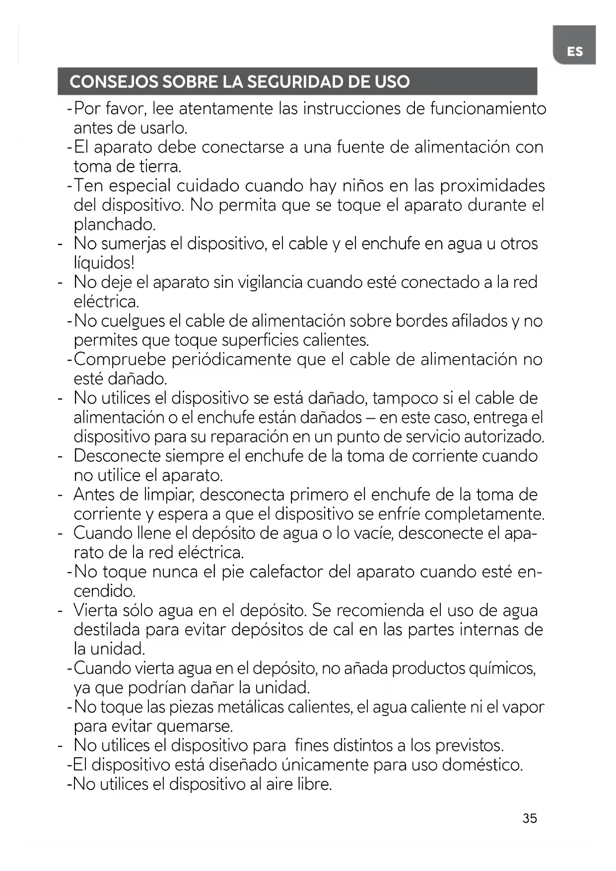 No toque las piezas metálicas calientes, el agua caliente ni el vapor para evitar quemarse. - No utilices el dispositivo para fines distintos a los previstos. - El dispositivo está diseñado únicamente para uso doméstico. - No utilices el dispositivo al aire libre.36