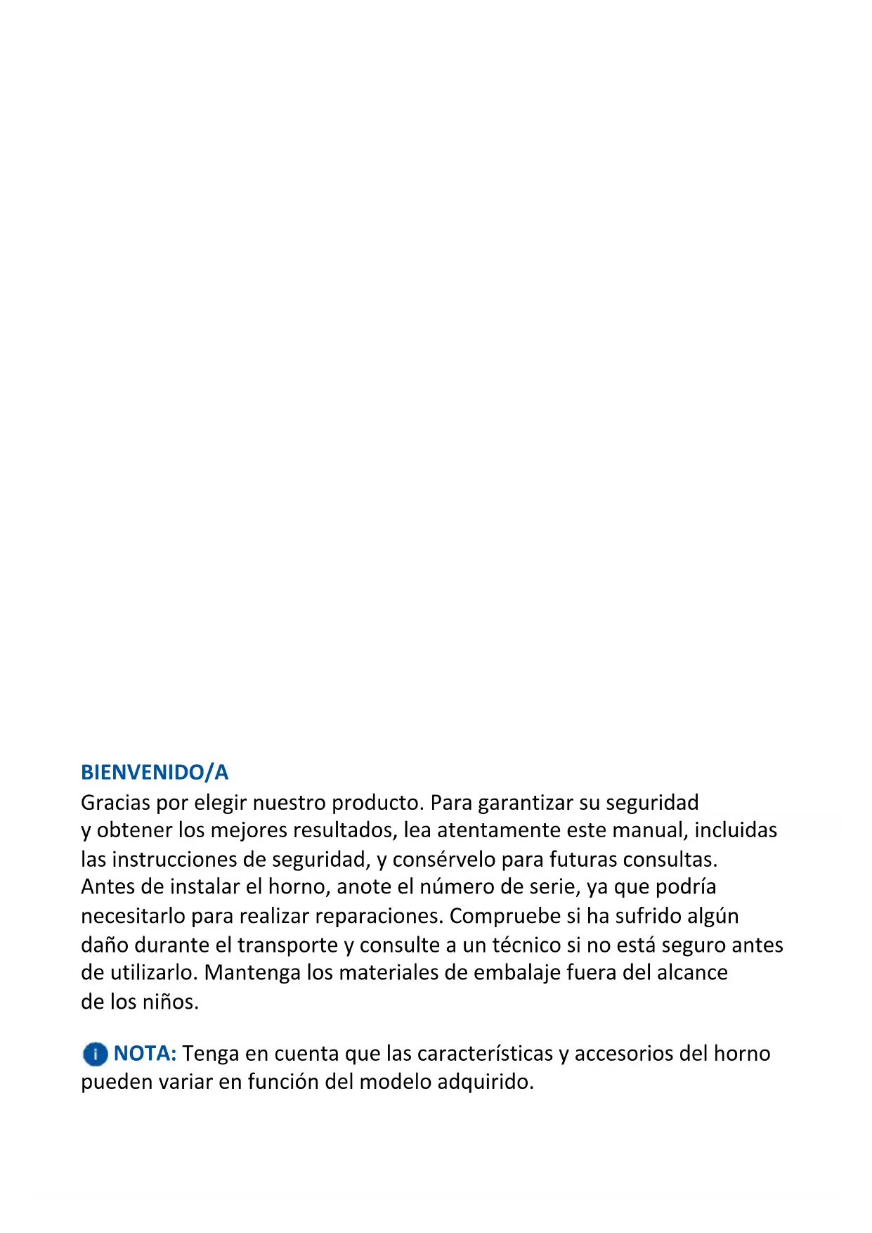 mmBIENVENIDO/A Gracias por elegir nuestro producto. Para garantizar su seguridad y obtener los mejores resultados, lea atentamente este manual, incluidas las instrucciones de seguridad, y consérvelo para futuras consultas. Antes de instalar el horno, anote el número de serie, ya que podría necesitarlo para realizar reparaciones. Compruebe si ha sufrido algún daño durante el transporte y consulte a un técnico si no está seguro antes de utilizarlo. Mantenga los materiales de embalaje fuera del alcance de los niños. NOTA: Tenga en cuenta que las características y accesorios del horno pueden variar en función del modelo adquirido.ÍNDICE