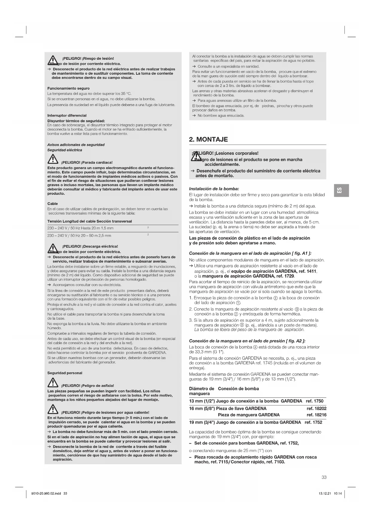 ¡PELIGRO! ¡Descarga eléctrica! Riesgo de lesión por corriente eléctrica. v Desconecte el producto de la red eléctrica antes de ponerlo fuera de servicio, realizar trabajos de mantenimiento o subsanar averías. La bomba debe instalarse sobre un firme estable, a resguardo de inundaciones, y debe asegurarse para evitar su caída. Instale la bomba a una distancia segura (mínimo de 2 m) del líquido. Como dispositivo adicional de seguridad se puede utilizar un interruptor de protección de personas homologado. v Aconsejamos consultar con su electricista. Si la línea de conexión a la red de este producto presentara daños, deberá encargarse su sustitución alfabricante o su servicio técnico o a una persona con una formación equivalente con el fin de evitar posibles peligros. Proteja el enchufe a la red y el cable de conexión a la red contra el calor, aceites y cantos agudos. No utilice el cable para transportar la bomba ni para desenchufar la toma de la base. No exponga la bomba a la lluvia. No debe utilizarse la bomba en ambiente húmedo. Compruebe a intervalos regulares de tiempo la tubería de conexión. Antes de cada uso, se debe efectuar un control visual de la bomba (en especial del cable de conexión a la red y del enchufe a la red). No está permitido el uso de una bomba defectuiosa. En caso de defectos, debe hacerse controlar la bomba por el servicio postventa de GARDENA. Si se utilizan nuestras bombas con un generador, deberán observarse las advertencias del fabricante del generador. Seguridad personal ¡PELIGRO! ¡Peligro de asfixia! Las piezas pequeñas se pueden ingerir con facilidad. Los niños pequeños corren el riesgo de asfixiarse con la bolsa. Por este motivo, mantenga a los niños pequeños alejados del lugar de montaje. ¡PELIGRO! ¡Peligro de lesiones por agua caliente! En el funciona miento durante largo tiempo (> 5 min.) con el lado de impulsión cerrado, se puede calentar el agua en la bomba y se pueden producir quemaduras por el agua caliente. v La bomba no debe funcionar más de 5 min. con el lado presión cerrado. Si en el lado de aspiración no hay alimen tación de agua, el agua que se encuentra en la bomba se puede calentar y provocar lesiones al salir. v Desconecte la bomba de la red de corriente a través del fusible doméstico, deje enfriar el agua y, antes de volver a poner en funciona- miento, cerciórese de que hay suministro de agua desde el lado de aspiración. Al conectar la bomba a la instalación de agua se deben cumplir las normas sanitarias específicas del país, para evitar la aspiración de agua no potable. v Consulte a un especialista en sanidad. Para evitar un funcionamiento en vacío de la bomba, procure que el extremo de la man guera de succión esté siempre dentro del liquido a bombear. v Antes de cada puesta en servicio se ha de llenar la bomba hasta el tope con cerca de 2a 3 ltrs. de líquido a bombear. Las arenas y otras materias abrasivas aceleran el desgaste y disminuyen el rendimiento de la bomba. v Para aguas arenosas utilize un filtro de la bomba. El bombeo de agua ensuciada, por ej, de piedras, pinocha y otros puede provocar daños en bomba. v No bombee agua ensuciada.