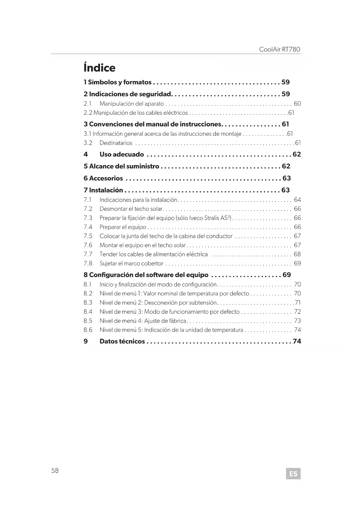 La información referente a la instalación y configuración incluida en estas instrucciones está dirigida a personal técnico de talleres familiarizado con las directivas y medidas de seguridad que se hayan de aplicar en la instalación de accesorios de camiones. RT780-Iveco--I-16s.book Seite 61 Donnerstag, 6. Juli 2017 3:16 15ES Uso adecuado CoolAir RT780