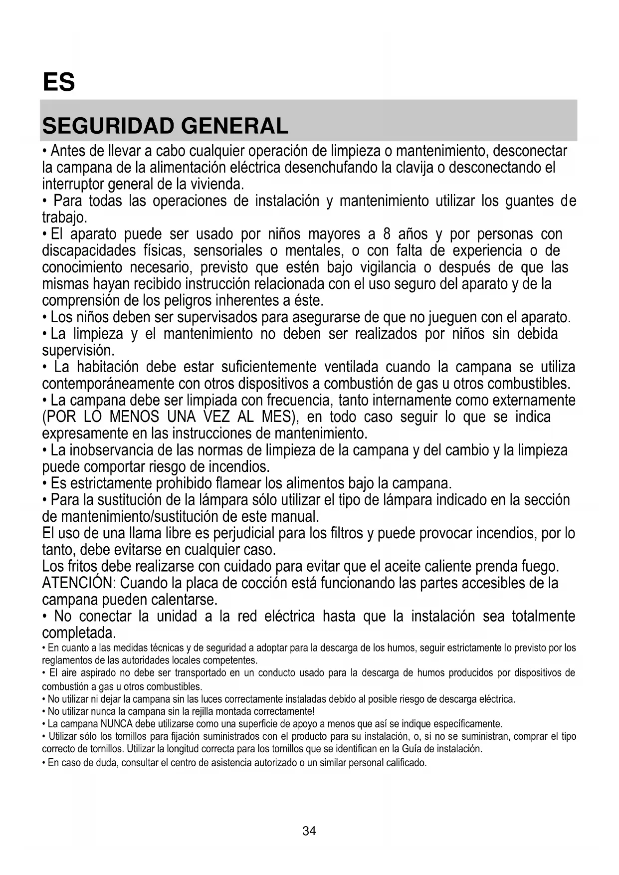 - Antes de llevar a cabo cualquier operación de limpieza o mantenimiento, desconectar la campana de la alimentación eléctrica desenchufando la clavija o desconectando el interruptor general de la vivienda.
