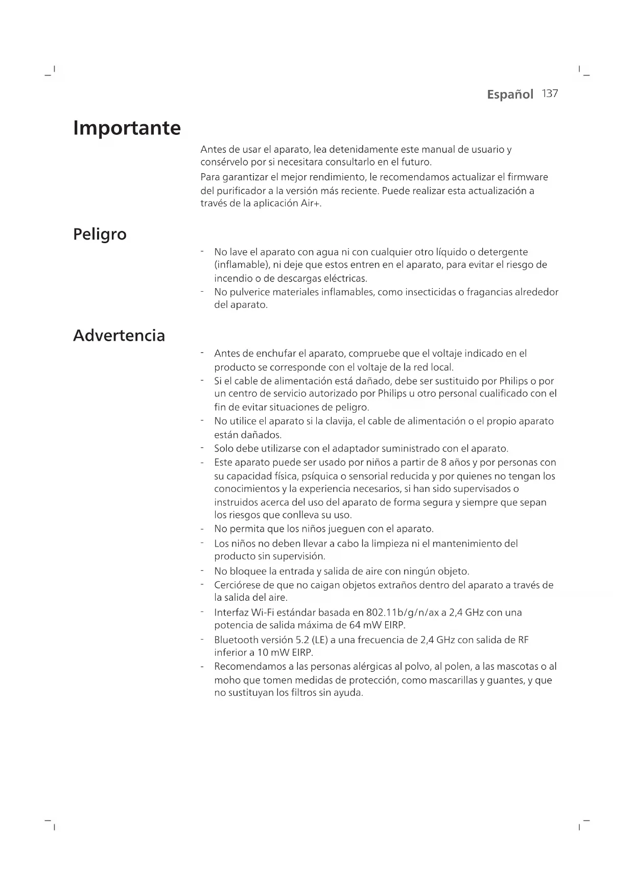 Bluetooth version 5.2 (LE) a una Frequencia de 2,4 GHz con calidad de RF inferior a 10 mW EIRP. - Recomendamos a las personas alergicas al polvo, al polen, a las mascetas o al moho que tomen medidas de proteccion, como mascarillas y guantes, y que no sustituyan los filtros sin ayud.