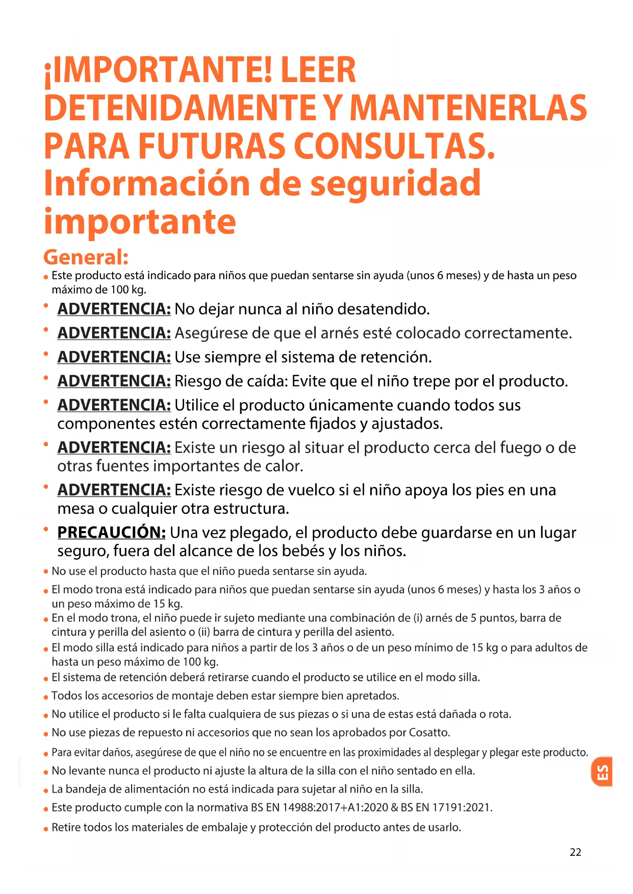 ADVERTENCIA: Existe riesgo de vuelco si el niño apoya los pies en una mesa o cualquier otra estructura.