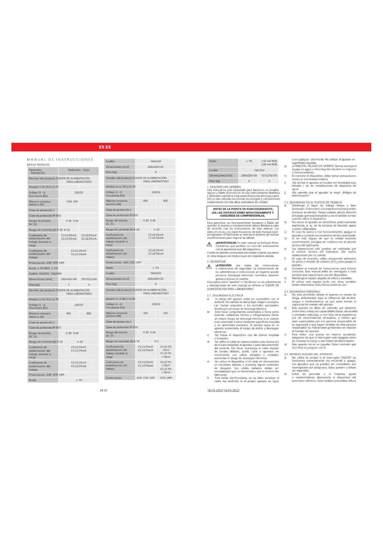 Clase de protección I Clase de protección IP IP20 Rango de tensión DC [V] 0-30 0-60 Rango de corriente [A] 0-50 0-10 Coeciente de estabilización del trabajo durante la carga CV≤0,3%mV CC≤0,3%mA CV≤0,5%mV CC≤0,5%mA Coeciente de estabilización del trabajo CV≤0,2%mV CC≤0,5%mA Protecciones OVP, OTP, OPP Ruido ≤ 1% RMS ≤ 1% Fusible 15A250V 10A250V Dimensiones [mm] 260x365x160 197x322x145 Peso [kg] 7 4 Nombre del producto FUENTE DE ALIMENTACIÓN PARA LABORATORIO Modelo S-LS-78 S-LS-79 Voltaje [V ~]/ Frecuencia [Hz] 230/50 Máximo consumo eléctrico [W]