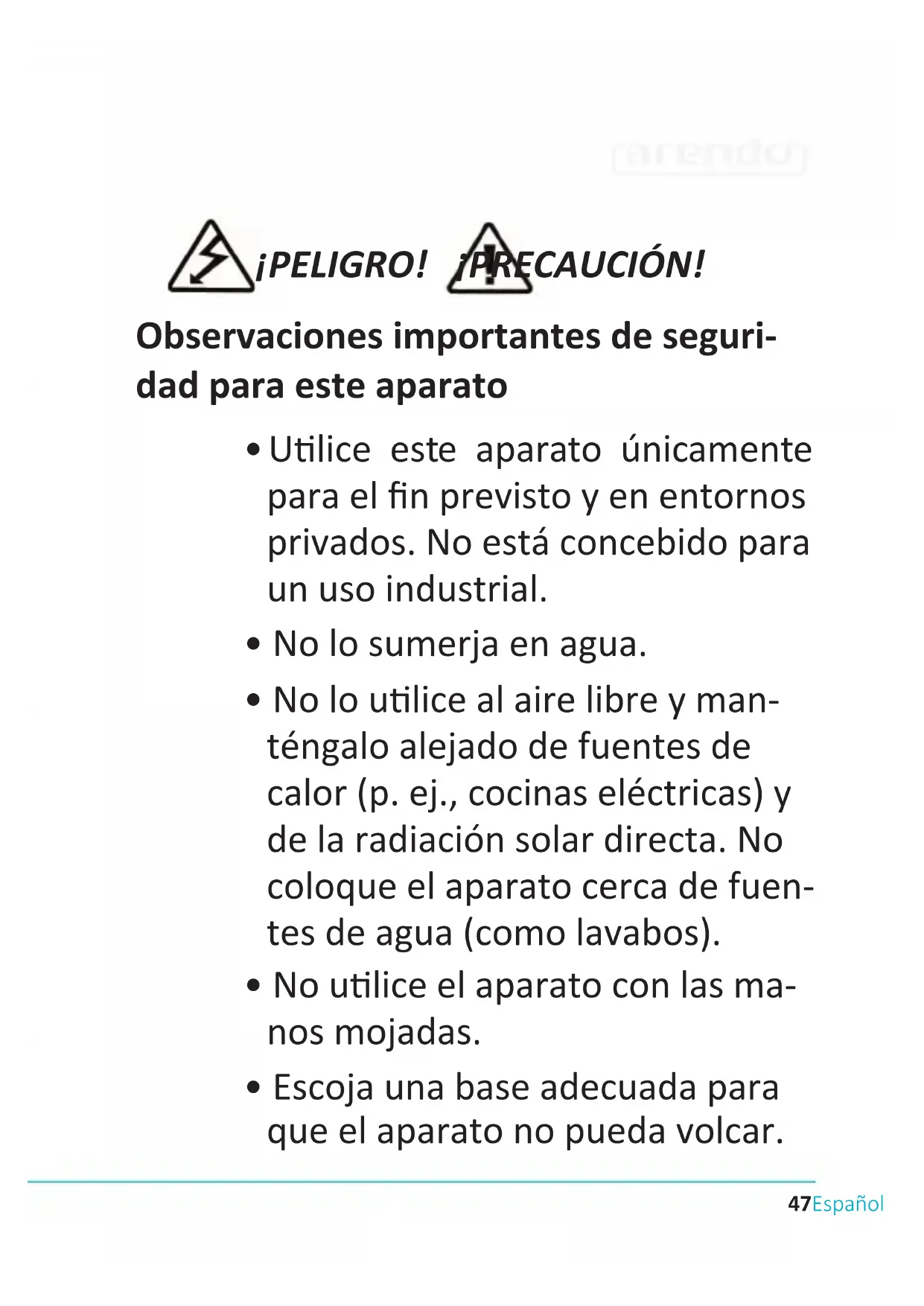 - Este aparato se ha diseñado para ser ulizado en hogares y con nes similares. Por ejemplo, - en cocinas en negocios, oci- nas y otros entornos laborales; - en ncas agrícolas; - por parte de clientes en hote- les, moteles y otras instalaciones residenciales52 Español Gracias por escoger un producto de Arendo. Para que pueda disfrutar de su adqui- sición, le rogamos que lea atentamente las siguientes instrucciones de uso. Antes de ponerlo en marcha, compruebe que el producto suministrado no presenta de- fectos ni daños.
