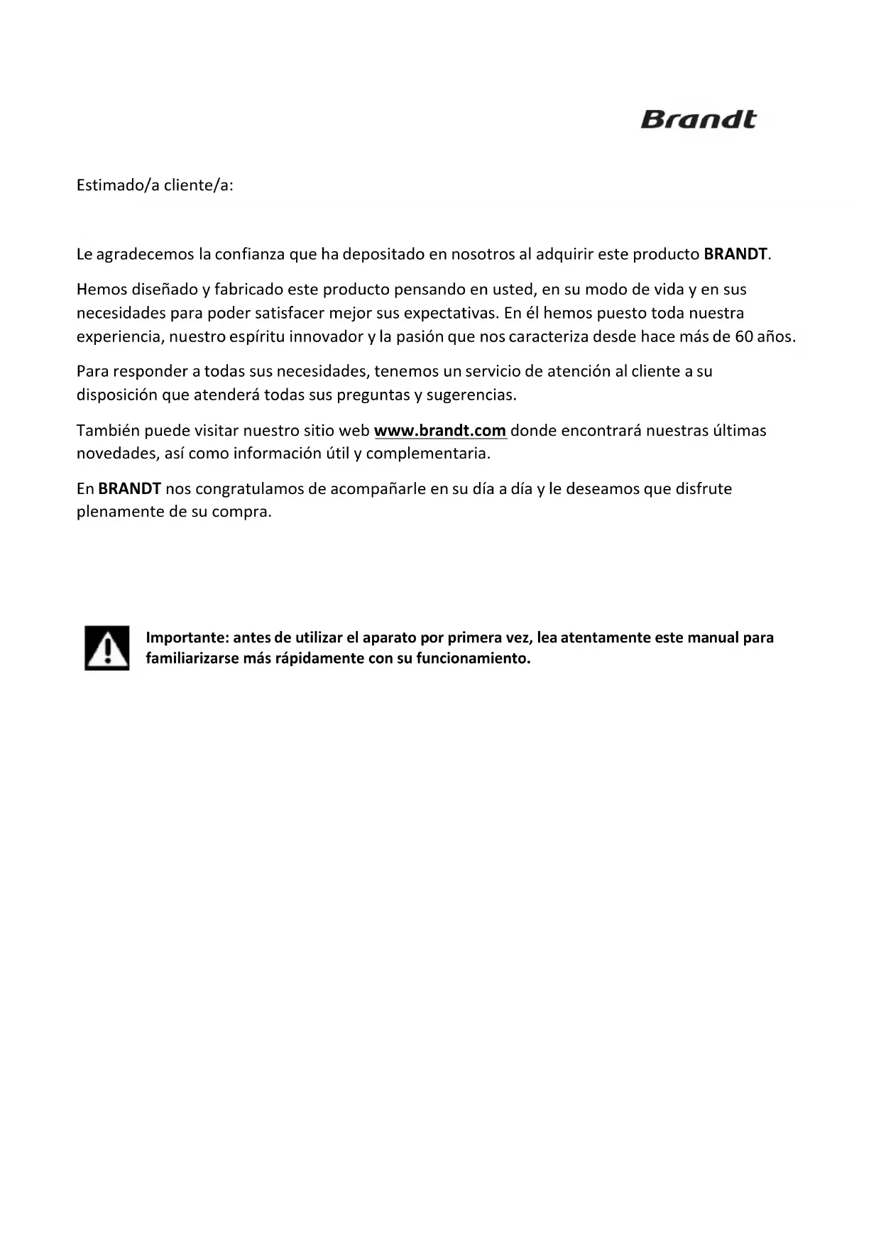 Le agradecemos la confianza que ha depositado en nosotros al adquirir este producto BRANDT. Hemos diseñado y fabricado este producto pensando en usted, en su modo de vida y en sus necesidades para poder satisfacer mejor sus expectativas. En él hemos puesto toda nuestra experiencia, nuestro espíritu innovador y la pasión que nos caracteriza desde hace más de 60 años. Para responder a todas sus necesidades, tenemos un servicio de atención al cliente a su disposición que atenderá todas sus preguntas y sugerencias. También puede visitar nuestro sitio web www.brandt.com donde encontrará nuestras últimas novedades, así como información útil y complementaria. En BRANDT nos congratulamos de acompañarle en su día a día y le deseamos que disfrute plenamente de su compra.