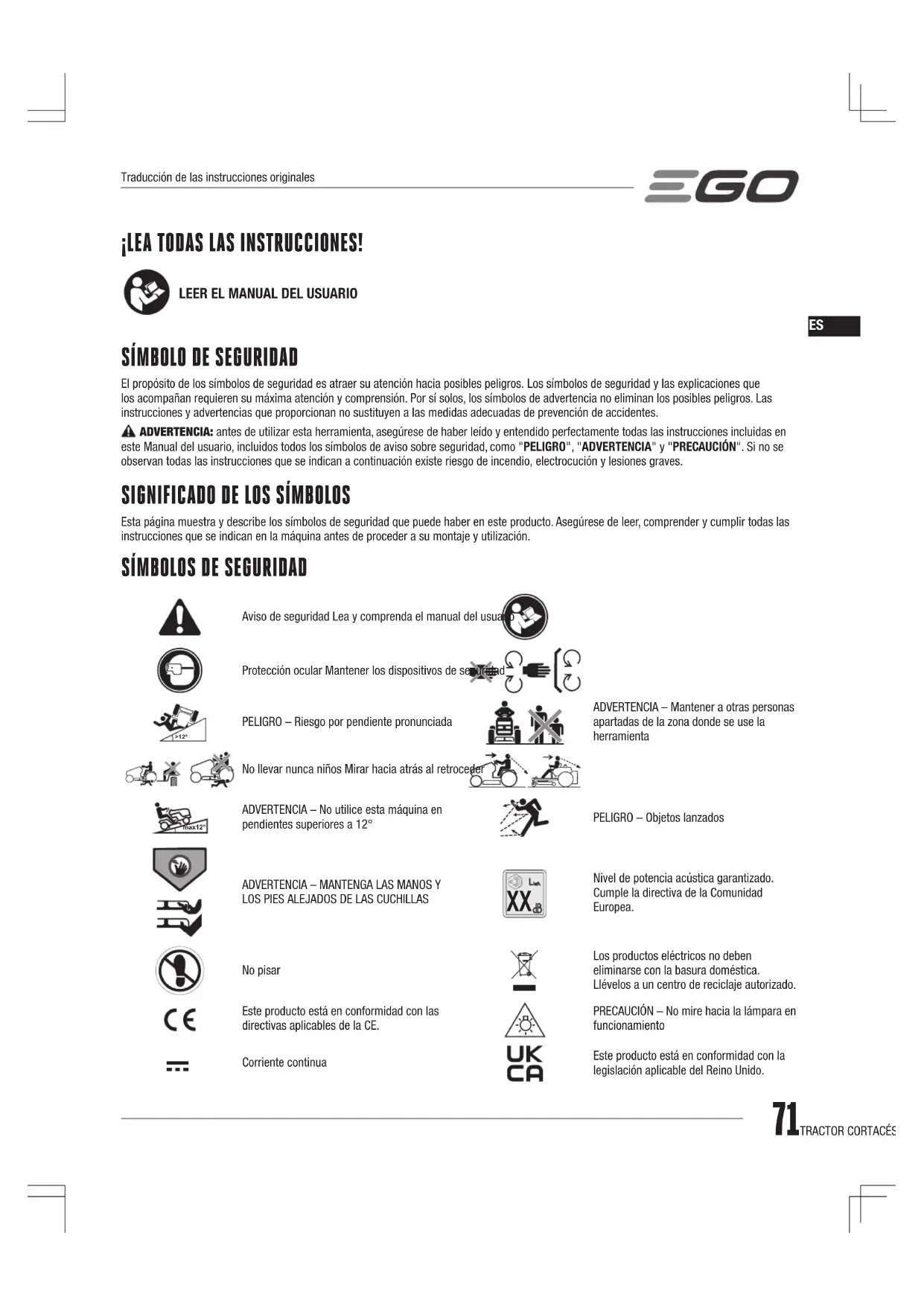 Aviso de seguridad Lea y comprenda el manual del usuarioProtección ocular Mantener los dispositivos de seguridad>12°PELIGRO – Riesgo por pendiente pronunciadaADVERTENCIA – Mantener a otras personas apartadas de la zona donde se use la herramientaNo llevar nunca niños Mirar hacia atrás al retrocedermax12°ADVERTENCIA – No utilice esta máquina en pendientes superiores a 12°PELIGRO – Objetos lanzadosADVERTENCIA – MANTENGA LAS MANOS Y LOS PIES ALEJADOS DE LAS CUCHILLAS Nivel de potencia acústica garantizado. Cumple la directiva de la Comunidad Europea.No pisarLos productos eléctricos no deben eliminarse con la basura doméstica. Llévelos a un centro de reciclaje autorizado.Este producto está en conformidad con las directivas aplicables de la CE.PRECAUCIÓN – No mire hacia la lámpara en funcionamientoCorriente continuaEste producto está en conformidad con la legislación aplicable del Reino Unido.Traducción de las instrucciones originalesTRACTOR CORTACÉSPED ELÉCTRICO — TR4200E72 kPa Kilopascal RPM Revoluciones por minutoV Voltio m Metrosin Pulgada cm CentímetrosNm Newtonmetro mm Milímetros°C Celsius kg Kilogramo km/h Kilómetros por hora IPX4 Grado de protección contra la penetración