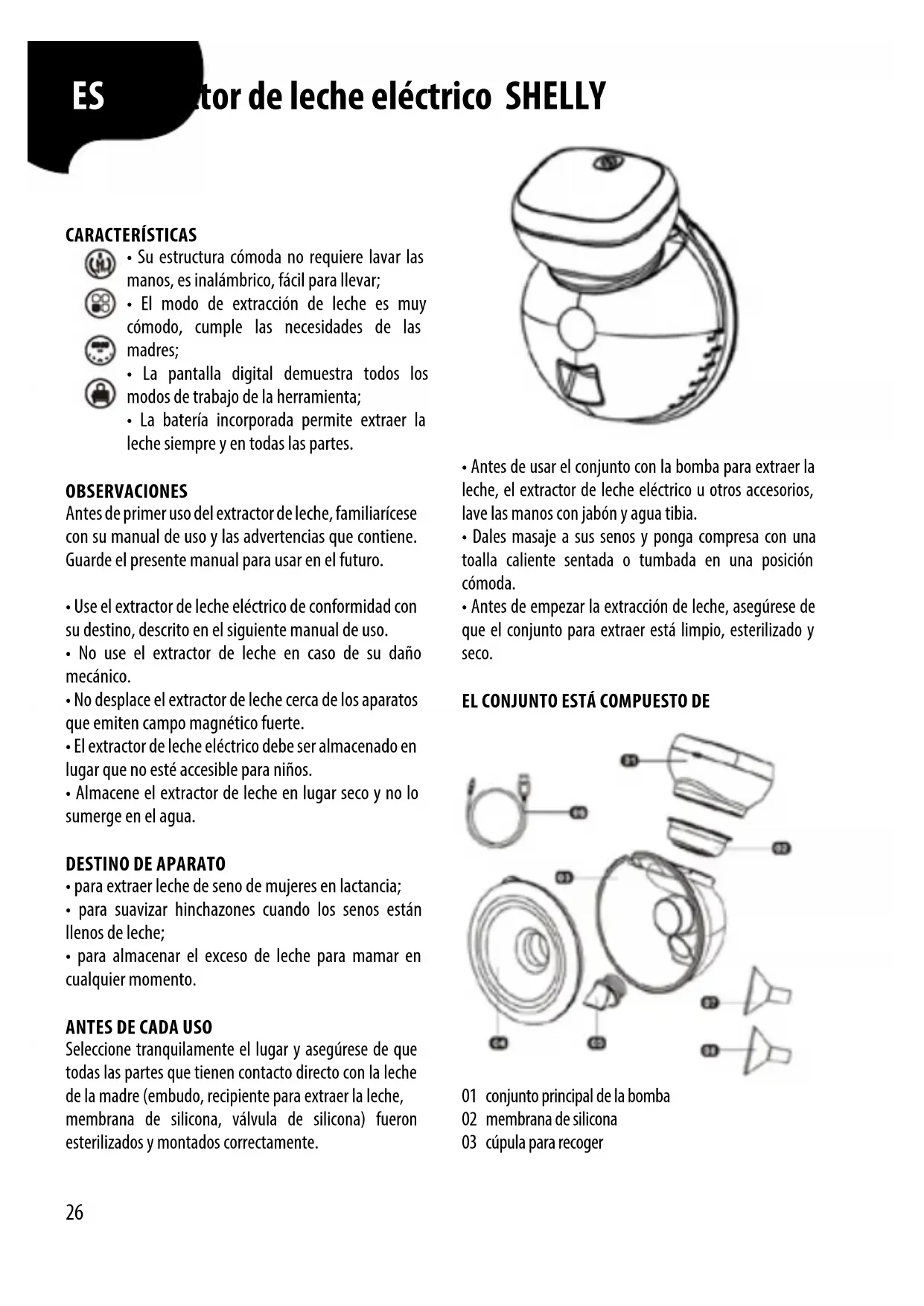 Seleccione tranquilamente el lugar y asegúrese de que todas las partes que tienen contacto directo con la leche de la madre (embudo, recipiente para extraer la leche, membrana de silicona, válvula de silicona) fueron esterilizados y montados correctamente. ES Extractor de leche eléctrico SHELLY