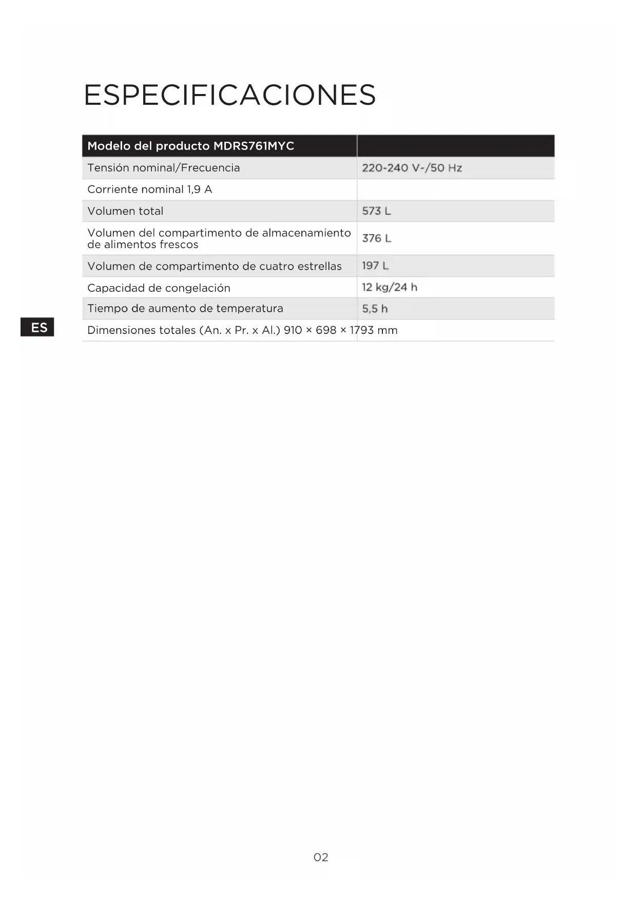 ESPECIFICACIONES Modelo del producto MDRS761MYC Tensión nominal/Frecuencia Corriente nominal 1,9 A Volumen total Volumen del compartimento de almacenamiento de alimentos frescos Volumen de compartimento de cuatro estrellas Capacidad de congelación Tiempo de aumento de temperatura Dimensiones totales (An. x Pr. x Al.) 910 × 698 × 1793 mm03