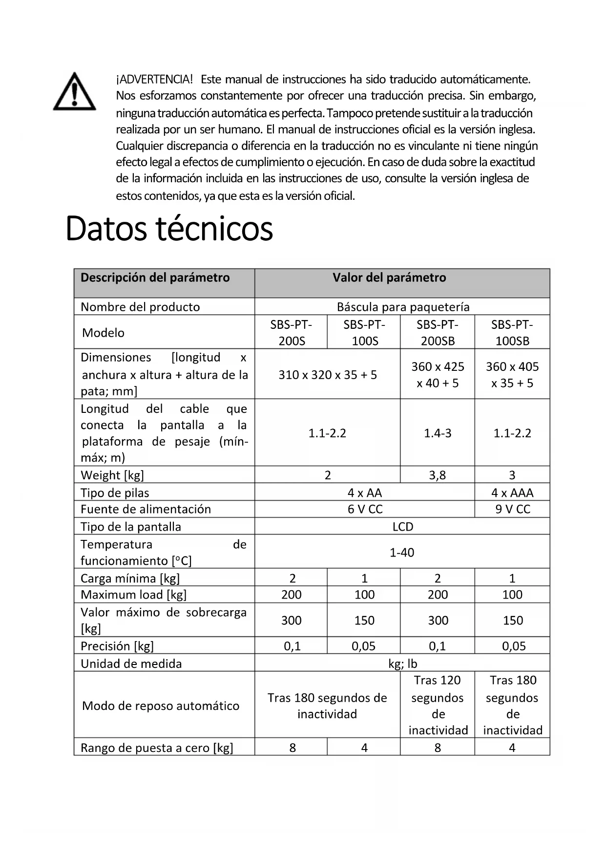 ¡ADVERTENCIA! Este manual de instrucciones ha sido traducido automáticamente. Nos esforzamos constantemente por ofrecer una traducción precisa. Sin embargo, ninguna traducción automática es perfecta. Tampoco pretende sustituir a la traducción realizada por un ser humano. El manual de instrucciones oficial es la versión inglesa. Cualquier discrepancia o diferencia en la traducción no es vinculante ni tiene ningún efecto legal a efectos de cumplimiento o ejecución. En caso de duda sobre la exactitud de la información incluida en las instrucciones de uso, consulte la versión inglesa de estos contenidos, ya que esta es la versión oficial.Descripción del parámetro Valor del parámetro Nombre del producto Báscula para paquetería Modelo SBS-PT-200SK SBS-PT-100SK Dimensiones [longitud × anchura × altura; mm] 360 x 405 x 65 Dimensiones de la pantalla [mm] 135 x 65 Weight [kg] 3,5 Tipo de pilas 4 x AA Fuente de alimentación 6 V CC Tipo de la pantalla LCD Temperatura de funcionamiento [