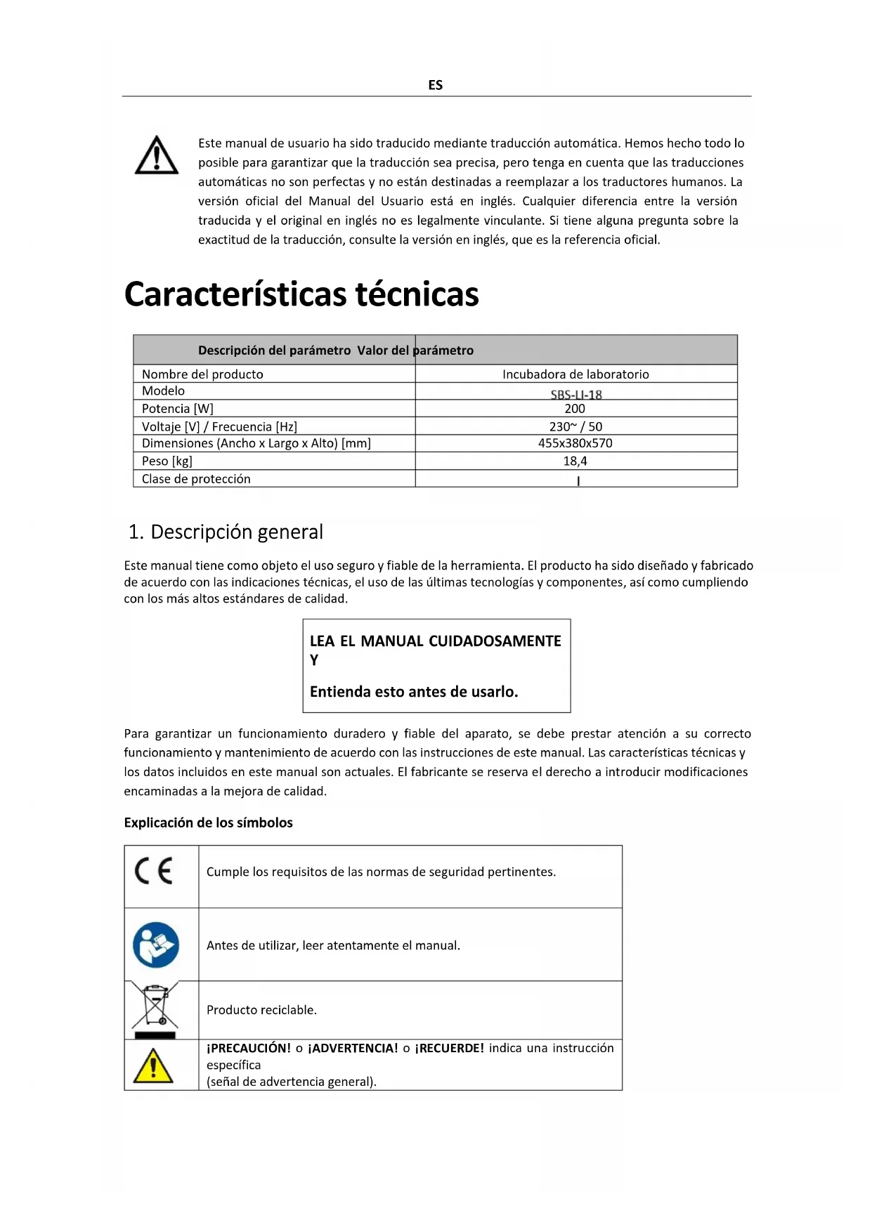 Entienda esto antes de usarlo. Para garantizar un funcionamiento duradero y fiable del aparato, se debe prestar atención a su correcto funcionamiento y mantenimiento de acuerdo con las instrucciones de este manual. Las características técnicas y los datos incluidos en este manual son actuales. El fabricante se reserva el derecho a introducir modificaciones encaminadas a la mejora de calidad. Explicación de los símbolos Cumple los requisitos de las normas de seguridad pertinentes. Antes de utilizar, leer atentamente el manual.