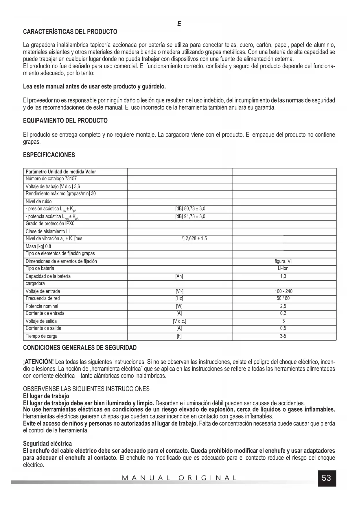 El producto se entrega completo y no requiere montaje. La cargadora viene con el producto. El empaque del producto no contiene grapas. ESPECIFICACIONES Parámetro Unidad de medida Valor Número de catálogo 78157 Voltaje de trabajo [V d.c.] 3,6 Rendimiento máximo [grapas/min] 30 Nivel de ruido - presión acústica L