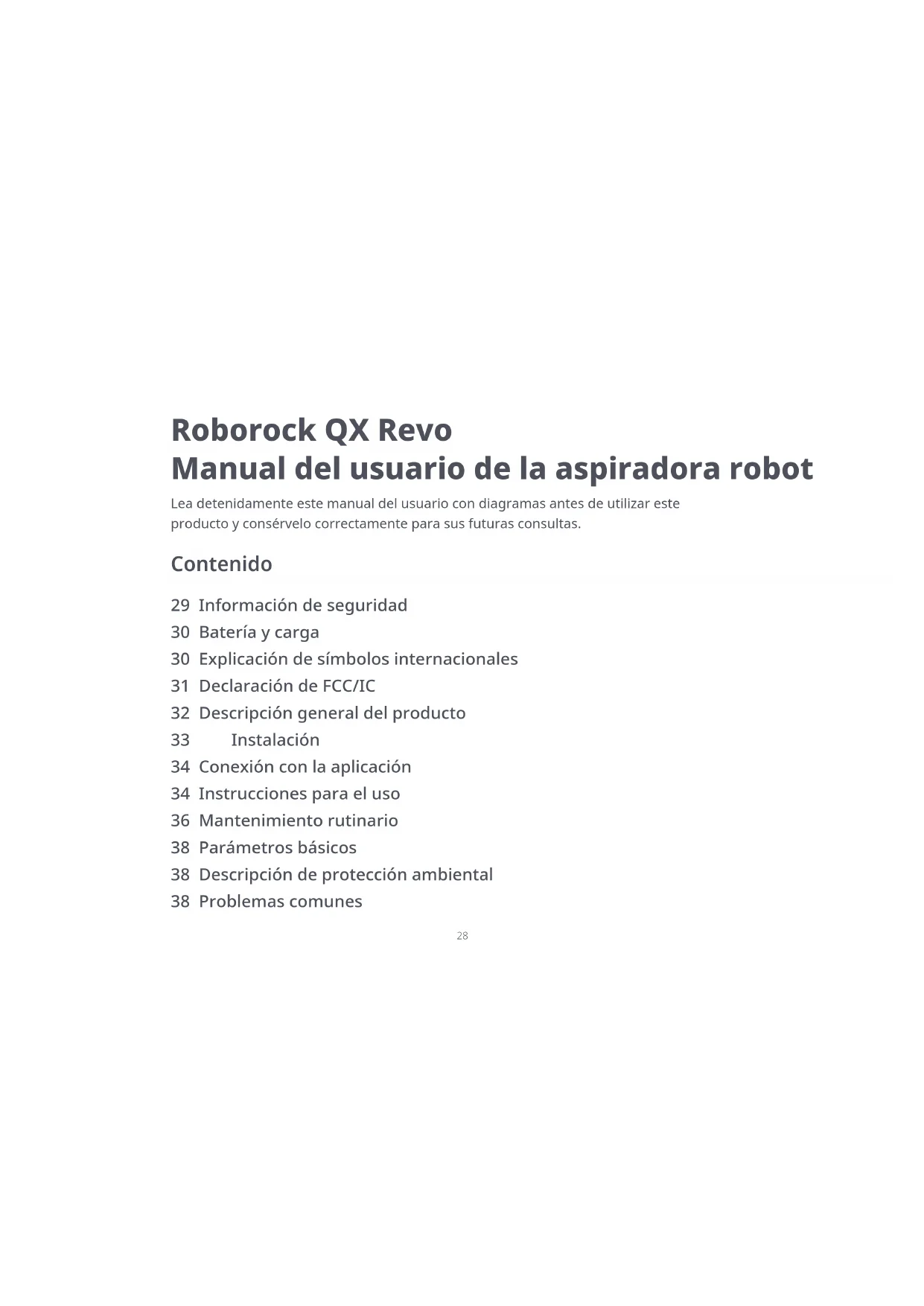 connecteur de la batterie, puis retirez la batterie. Comment retirer la batterie : batterie doit ensuite être correctement recyclée, soit par l’intermédiaire des autorités locales, soit en la remettant à un centre de recyclage de batteries. Problèmes courants Scannez le code QR ci-dessous pour consulter les problèmes courants.28 29 Información de seguridad 30 Batería y carga 30 Explicación de símbolos internacionales 31 Declaración de FCC/IC 32 Descripción general del producto 33 Instalación 34 Conexión con la aplicación 34 Instrucciones para el uso 36 Mantenimiento rutinario 38 Parámetros básicos 38 Descripción de protección ambiental 38 Problemas comunes Roborock QX Revo Manual del usuario de la aspiradora robot Lea detenidamente este manual del usuario con diagramas antes de utilizar este producto y consérvelo correctamente para sus futuras consultas. Contenido Español29 Información de seguridad ADVERTENCIA