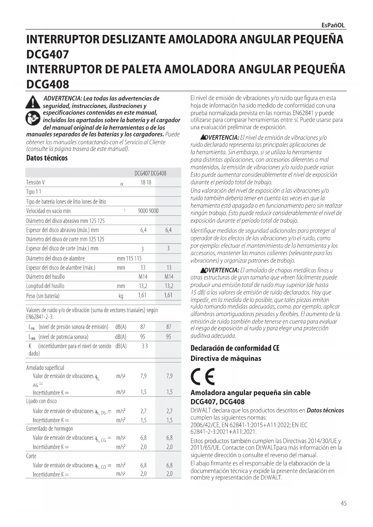 Amoladora angular pequeña sin cable DCG407, DCG408 DeWALT declara que los productos descritos en Datos técnicos cumplen las siguientes normas: 2006/42/CE, EN 62841‑1:2015+A11:2022; EN IEC 62841‑2‑3:2021+A11:2021.Estos productos también cumplen las Directivas 2014/30/UE y 2011/65/UE. Contacte con DeWALTpara más información en la siguiente dirección o consulte el reverso delmanual.El abajo firmante es el responsable de la elaboración de la documentación técnica y expide la presente declaración en nombre y representación deDeWALT.El nivel de emisión de vibraciones y/o ruido que figura en esta hoja de información ha sido medido de conformidad con una prueba normalizada prevista en las normas EN62841 y puede utilizarse para comparar herramientas entre sí. Puede usarse para una evaluación preliminar deexposición. ADVERTENCIA: El nivel de emisión de vibraciones y/o ruido declarado representa las principales aplicaciones de la herramienta. Sin embargo, si se utiliza la herramienta para distintas aplicaciones, con accesorios diferentes o mal mantenidos, la emisión de vibraciones y/o ruido puede variar. Esto puede aumentar considerablemente el nivel de exposición durante el período total detrabajo.Una valoración del nivel de exposición a las vibraciones y/o ruido también debería tener en cuenta las veces en que la herramienta está apagada o en funcionamiento pero sin realizar ningún trabajo. Esto puede reducir considerablemente el nivel de exposición durante el periodo total detrabajo.Identifique medidas de seguridad adicionales para proteger al operador de los efectos de las vibraciones y/o el ruido, como por ejemplo: efectuar el mantenimiento de la herramienta y los accesorios, mantener las manos calientes (relevante para las vibraciones) y organizar patrones detrabajo. ADVERTENCIA: El amolado de chapas metálicas finas u otras estructuras de gran tamaño que vibren fácilmente puede producir una emisión total de ruido muy superior (de hasta 15dB) a los valores de emisión de ruido declarados. Hay que impedir, en la medida de lo posible, que tales piezas emitan ruido tomando medidas adecuadas, como, por ejemplo, aplicar alfombras amortiguadoras pesadas y flexibles. El aumento de la emisión de ruido también debe tenerse en cuenta para evaluar el riesgo de exposición al ruido y para elegir una protección auditivaadecuada.DCG407 DCG408Tensión V 18 18Tipo 1 1Tipo de batería Iones de litio Iones de litioVelocidad en vacío min 9000 9000Diámetro del disco abrasivo mm 125 125Espesor del disco abrasivo (máx.) mm 6,4 6,4 Diámetro del disco de corte mm 125 125Espesor del disco de corte (máx.) mm