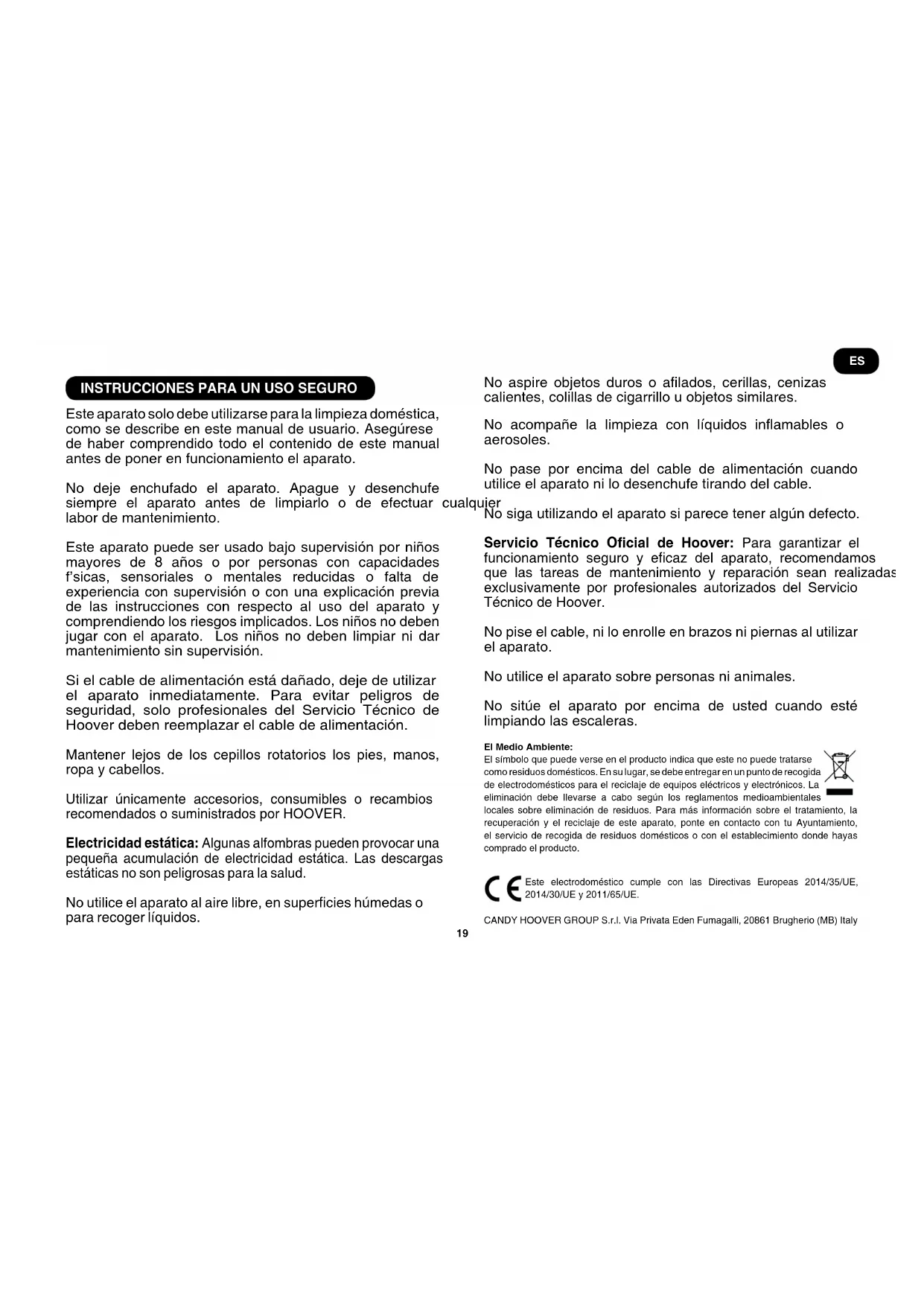 Este aparato solo debe utilizarse para la limpieza doméstica, como se describe en este manual de usuario. Asegúrese de haber comprendido todo el contenido de este manual antes de poner en funcionamiento el aparato. No deje enchufado el aparato. Apague y desenchufe siempre el aparato antes de limpiarlo o de efectuar cualquier labor de mantenimiento. Este aparato puede ser usado bajo supervisión por niños mayores de 8 años o por personas con capacidades físicas, sensoriales o mentales reducidas o falta de experiencia con supervisión o con una explicación previa de las instrucciones con respecto al uso del aparato y comprendiendo los riesgos implicados. Los niños no deben jugar con el aparato. Los niños no deben limpiar ni dar mantenimiento sin supervisión. Si el cable de alimentación está dañado, deje de utilizar el aparato inmediatamente. Para evitar peligros de seguridad, solo profesionales del Servicio Técnico de Hoover deben reemplazar el cable de alimentación. Mantener lejos de los cepillos rotatorios los pies, manos, ropa y cabellos. Utilizar únicamente accesorios, consumibles o recambios recomendados o suministrados por HOOVER. Electricidad estática: Algunas alfombras pueden provocar una pequeña acumulación de electricidad estática. Las descargas estáticas no son peligrosas para la salud. No utilice el aparato al aire libre, en supercies húmedas o para recoger líquidos. No aspire objetos duros o alados, cerillas, cenizas calientes, colillas de cigarrillo u objetos similares. No acompañe la limpieza con líquidos inamables o aerosoles. No pase por encima del cable de alimentación cuando utilice el aparato ni lo desenchufe tirando del cable. No siga utilizando el aparato si parece tener algún defecto. Servicio Técnico Ocial de Hoover: Para garantizar el funcionamiento seguro y ecaz del aparato, recomendamos que las tareas de mantenimiento y reparación sean realizadas exclusivamente por profesionales autorizados del Servicio Técnico de Hoover. No pise el cable, ni lo enrolle en brazos ni piernas al utilizar el aparato. No utilice el aparato sobre personas ni animales. No sitúe el aparato por encima de usted cuando esté limpiando las escaleras. El Medio Ambiente: El símbolo que puede verse en el producto indica que este no puede tratarse como residuos domésticos. En su lugar, se debe entregar en un punto de recogida de electrodomésticos para el reciclaje de equipos eléctricos y electrónicos. La eliminación debe llevarse a cabo según los reglamentos medioambientales locales sobre eliminación de residuos. Para más información sobre el tratamiento, la recuperación y el reciclaje de este aparato, ponte en contacto con tu Ayuntamiento, el servicio de recogida de residuos domésticos o con el establecimiento donde hayas comprado el producto. Este electrodoméstico cumple con las Directivas Europeas 2014/35/UE, 2014/30/UE y 2011/65/UE. CANDY HOOVER GROUP S.r.l. Via Privata Eden Fumagalli, 20861 Brugherio (MB) Italy ES20