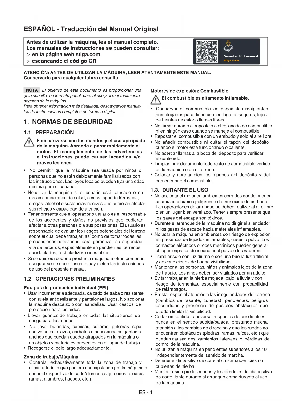 tional. The battery is charged. Fuse 5:A defect Replace the fuse 5:A. NOTE If problems persist after having performed the de- scribed operations, contact your dealer. NOTE For further problems not listed in the table, contact an au- thorised service centre immediately.ES - 1 Antes de utilizar la máquina, lea el manual completo. Los manuales de instrucciones se pueden consultar: ▷ en la página web stiga.com ▷ escaneando el código QR Download full manual stiga.com ESPAÑOL - Traducción del Manual Original ATENCIÓN: ANTES DE UTILIZAR LA MÁQUINA, LEER ATENTAMENTE ESTE MANUAL. Conservarlo para cualquier futura consulta. NOTA El objetivo de este documento es proporcionar una guía sencilla, en formato papel, para el uso y el mantenimiento seguros de la máquina. Para obtener información más detallada, descargar los manua- les de instrucciones completos en formato digital.