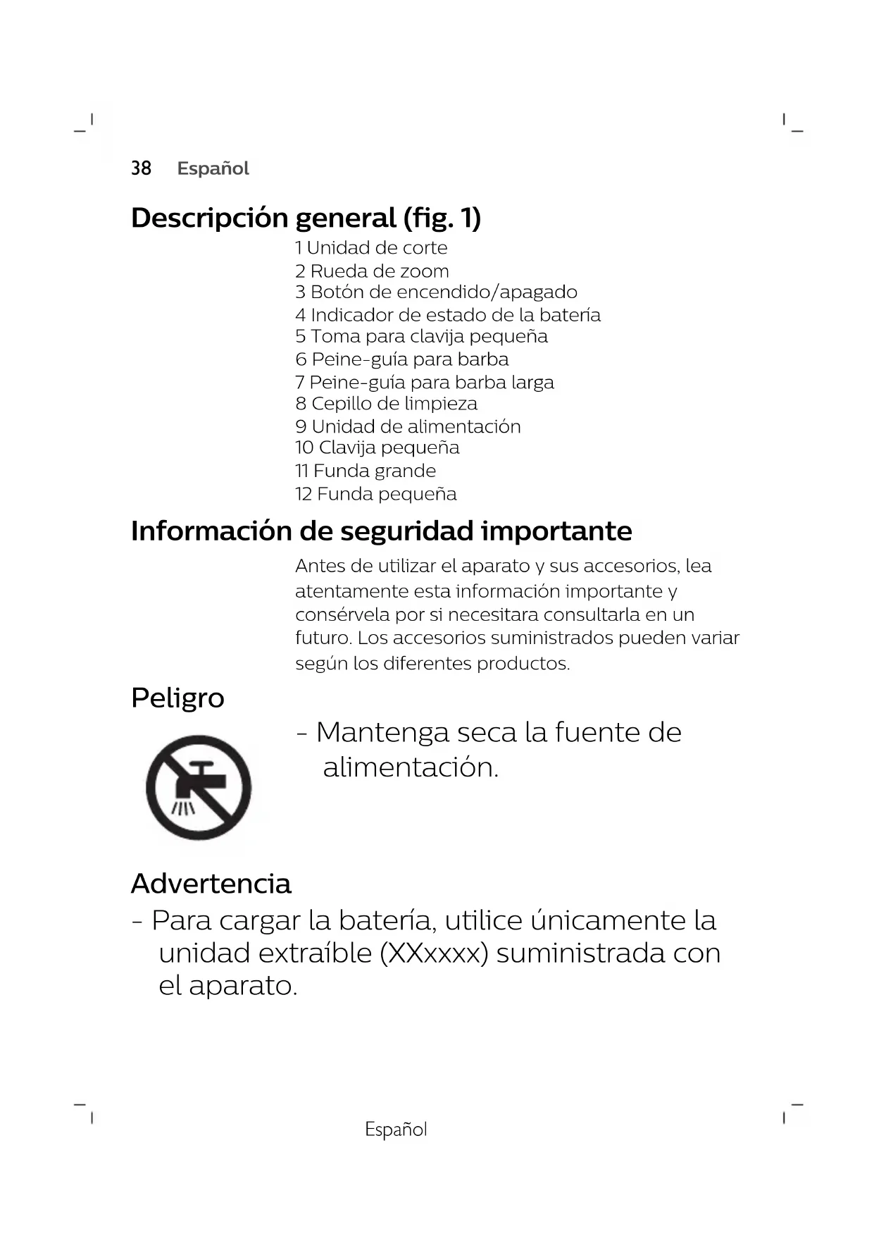 DeutschEspañol Descripción general (fig. 1) 1 Unidad de corte 2 Rueda de zoom 3 Botón de encendido/apagado 4 Indicador de estado de la batería 5 Toma para clavija pequeña 6 Peine-guía para barba 7 Peine-guía para barba larga 8 Cepillo de limpieza 9 Unidad de alimentación 10 Clavija pequeña 11 Funda grande 12 Funda pequeña Información de seguridad importante Antes de utilizar el aparato y sus accesorios, lea atentamente esta información importante y consérvela por si necesitara consultarla en un futuro. Los accesorios suministrados pueden variar según los diferentes productos. Peligro - Mantenga seca la fuente de alimentación. Advertencia - Para cargar la batería, utilice únicamente la unidad extraíble (XXxxxx) suministrada con el aparato.