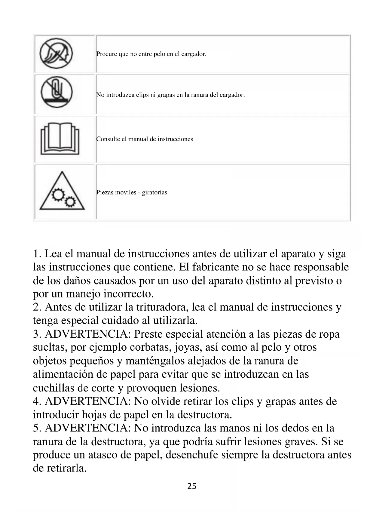 2. Antes de utilizar la trituradora, lea el manual de instrucciones y