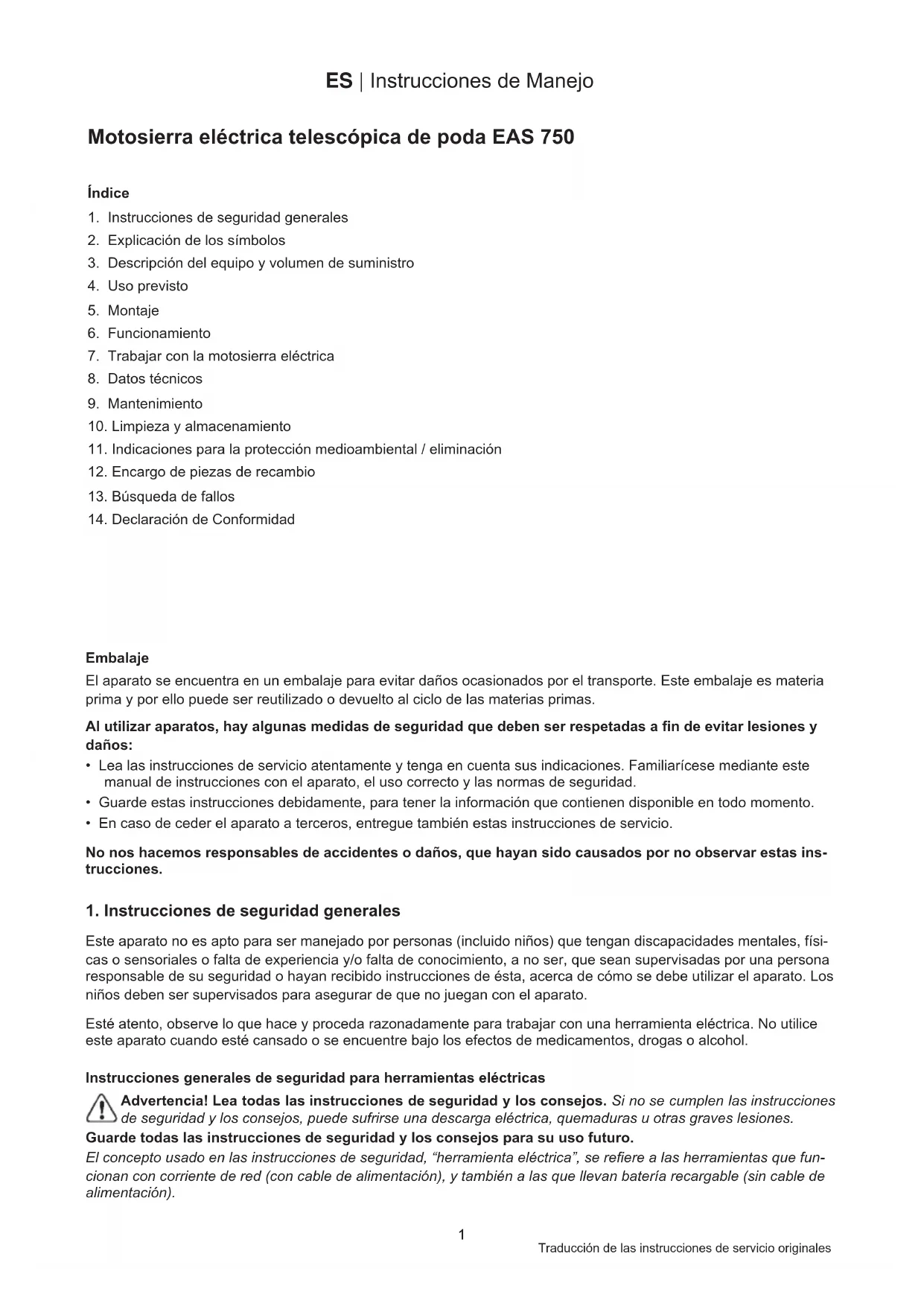 Motosierra eléctrica telescópica de poda EAS 750 Índice