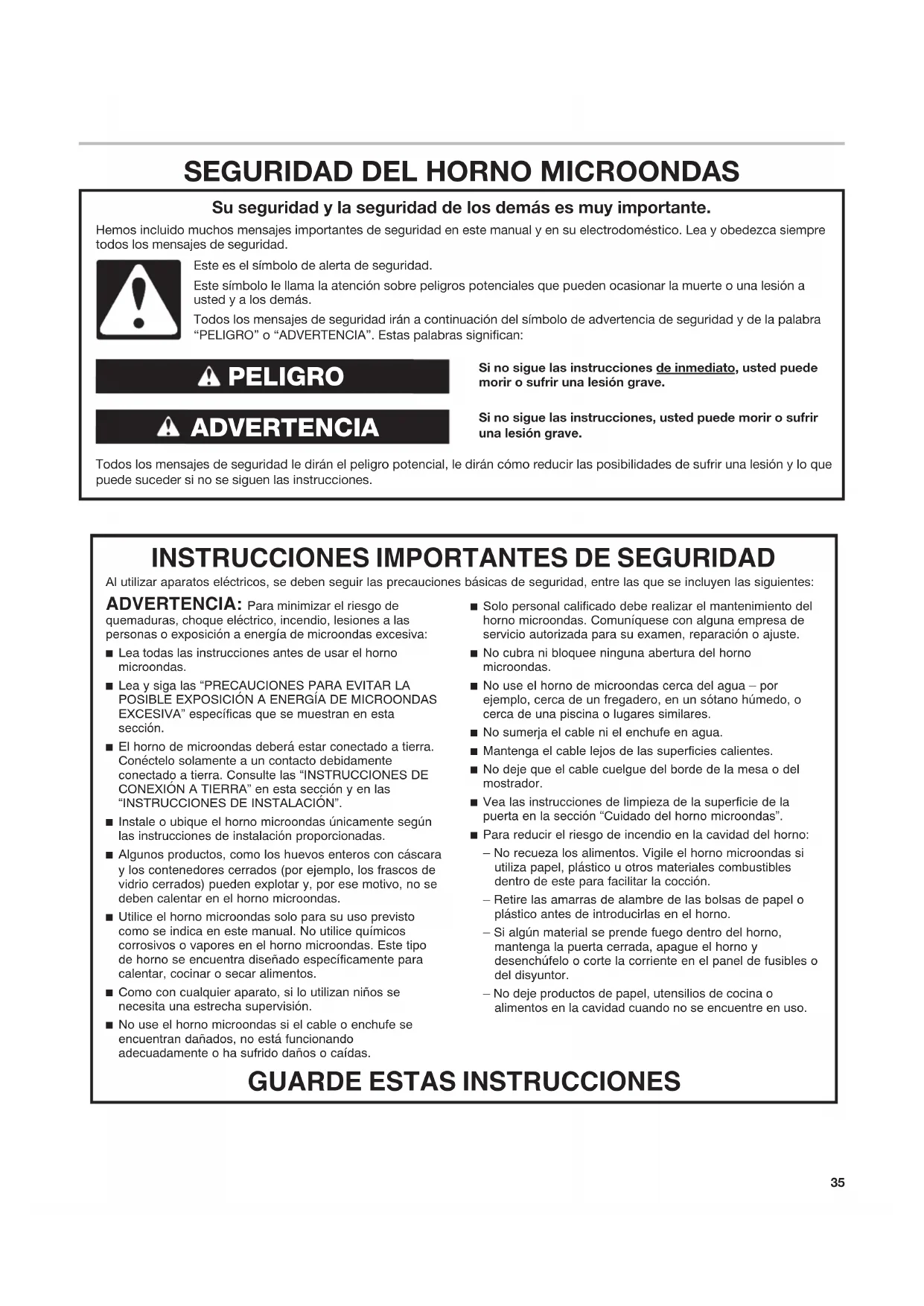 ADVERTENCIA: Para minimizar el riesgo de quemaduras, choque eléctrico, incendio, lesiones a las personas o exposición a energía de microondas excesiva:■ Lea todas las instrucciones antes de usar el horno microondas.■ Lea y siga las “PRECAUCIONES PARA EVITAR LA POSIBLE EXPOSICIÓN A ENERGÍA DE MICROONDAS EXCESIVA” específicas que se muestran en esta sección.■ El horno de microondas deberá estar conectado a tierra. Conéctelo solamente a un contacto debidamente conectado a tierra. Consulte las “INSTRUCCIONES DE CONEXIÓN A TIERRA” en esta sección y en las “INSTRUCCIONES DE INSTALACIÓN”.■ Instale o ubique el horno microondas únicamente según las instrucciones de instalación proporcionadas.■ Algunos productos, como los huevos enteros con cáscara y los contenedores cerrados (por ejemplo, los frascos de vidrio cerrados) pueden explotar y, por ese motivo, no se deben calentar en el horno microondas.■ Utilice el horno microondas solo para su uso previsto como se indica en este manual. No utilice químicos corrosivos o vapores en el horno microondas. Este tipo de horno se encuentra diseñado específicamente para calentar, cocinar o secar alimentos.■ Como con cualquier aparato, si lo utilizan niños se necesita una estrecha supervisión.■ No use el horno microondas si el cable o enchufe se encuentran dañados, no está funcionando adecuadamente o ha sufrido daños o caídas.■ Solo personal calificado debe realizar el mantenimiento del horno microondas. Comuníquese con alguna empresa de servicio autorizada para su examen, reparación o ajuste.■ No cubra ni bloquee ninguna abertura del horno microondas.■ No use el horno de microondas cerca del agua – por ejemplo, cerca de un fregadero, en un sótano húmedo, o cerca de una piscina o lugares similares.■ No sumerja el cable ni el enchufe en agua.■ Mantenga el cable lejos de las superficies calientes.■ No deje que el cable cuelgue del borde de la mesa o del mostrador.■ Vea las instrucciones de limpieza de la superficie de la puerta en la sección “Cuidado del horno microondas”.■ Para reducir el riesgo de incendio en la cavidad del horno:– No recueza los alimentos. Vigile el horno microondas si utiliza papel, plástico u otros materiales combustibles dentro de este para facilitar la cocción.– Retire las amarras de alambre de las bolsas de papel o plástico antes de introducirlas en el horno.– Si algún material se prende fuego dentro del horno, mantenga la puerta cerrada, apague el horno y desenchúfelo o corte la corriente en el panel de fusibles o del disyuntor.– No deje productos de papel, utensilios de cocina o alimentos en la cavidad cuando no se encuentre en uso.36