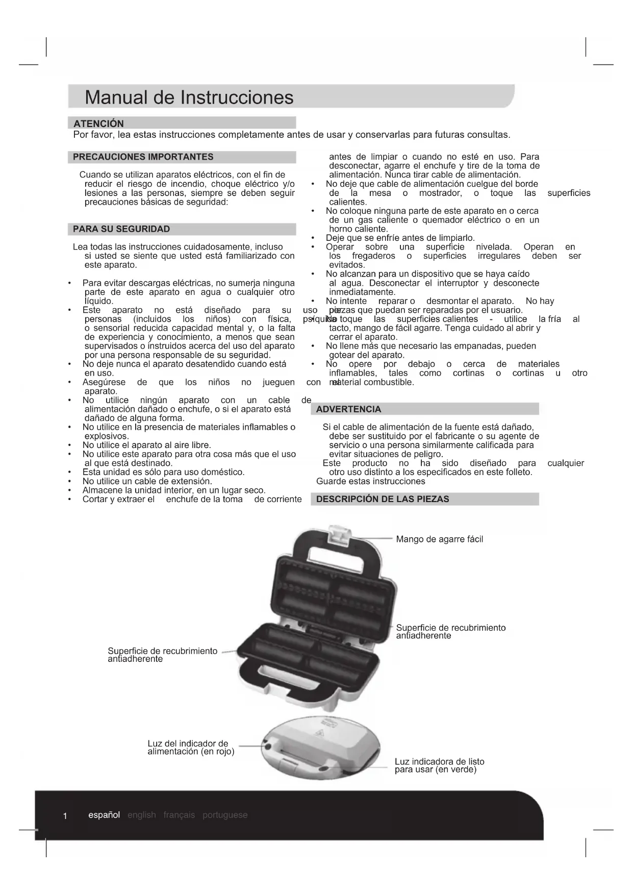 sque toque las superficies calientes -utilice la fría al tact, mango de fácil agarre. Tenga cuidado alAbrir y cerrar el aparato. - No llene más que你需要 las empanadas,把你 goear del aparato.