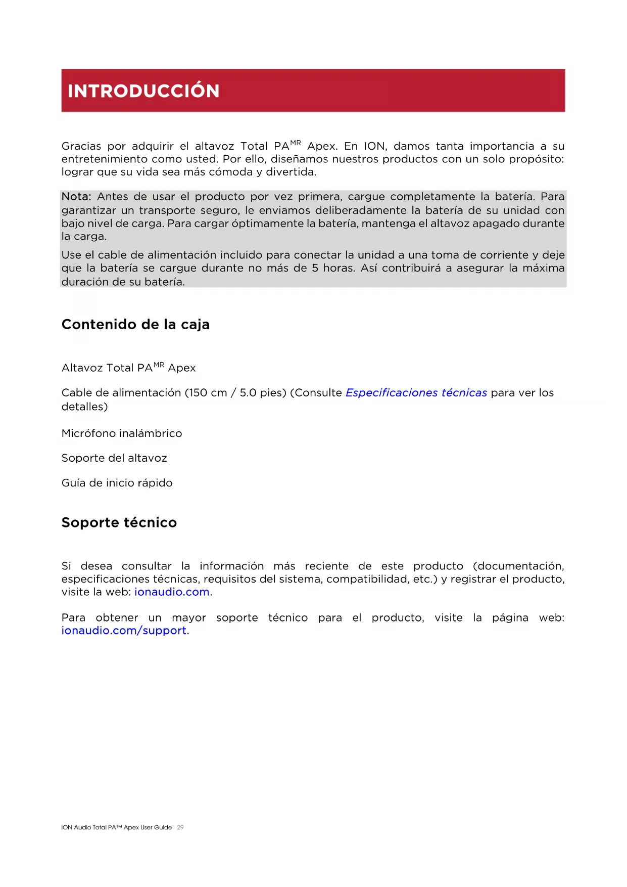 Apex. En ION, damos tanta importancia a su entretenimiento como usted. Por ello, diseñamos nuestros productos con un solo propósito: lograr que su vida sea más cómoda y divertida. Nota: Antes de usar el producto por vez primera, cargue completamente la batería. Para garantizar un transporte seguro, le enviamos deliberadamente la batería de su unidad con bajo nivel de carga. Para cargar óptimamente la batería, mantenga el altavoz apagado durante la carga. Use el cable de alimentación incluido para conectar la unidad a una toma de corriente y deje que la batería se cargue durante no más de 5 horas. Así contribuirá a asegurar la máxima duración de su batería.