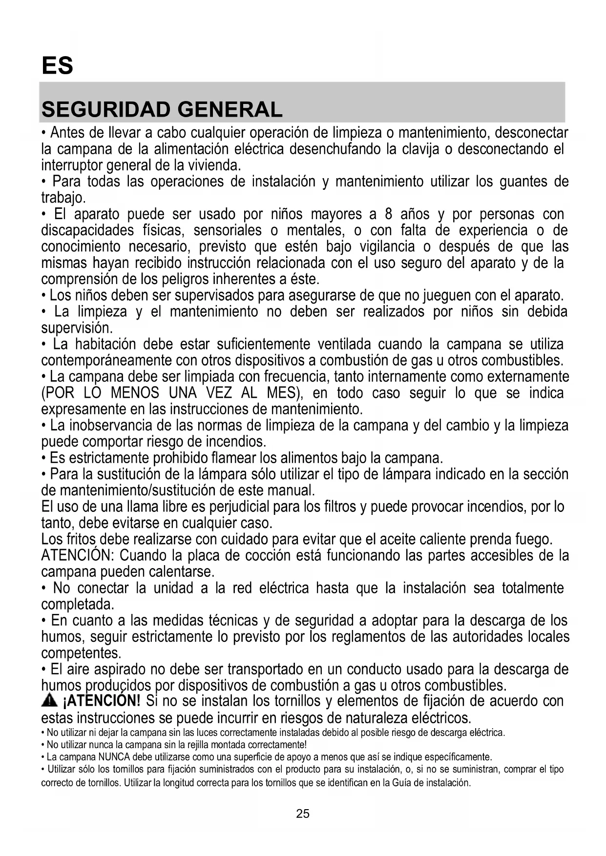 - Para la sustitución de la lámpara sólo utilizar el tipo de lámpara indicado en la sección de mantenimiento/sustitución de este manual. El uso de una llama libre es perjudicial para los filtros y puede provocar incendios, por lo tanto, debe evitarse en cualquier caso. Los fritos debe realizarse con cuidado para evitar que el aceite caliente prenda fuego. ATENCIÓN: Cuando la placa de cocción está funcionando las partes accesibles de la campana pueden calentarse.