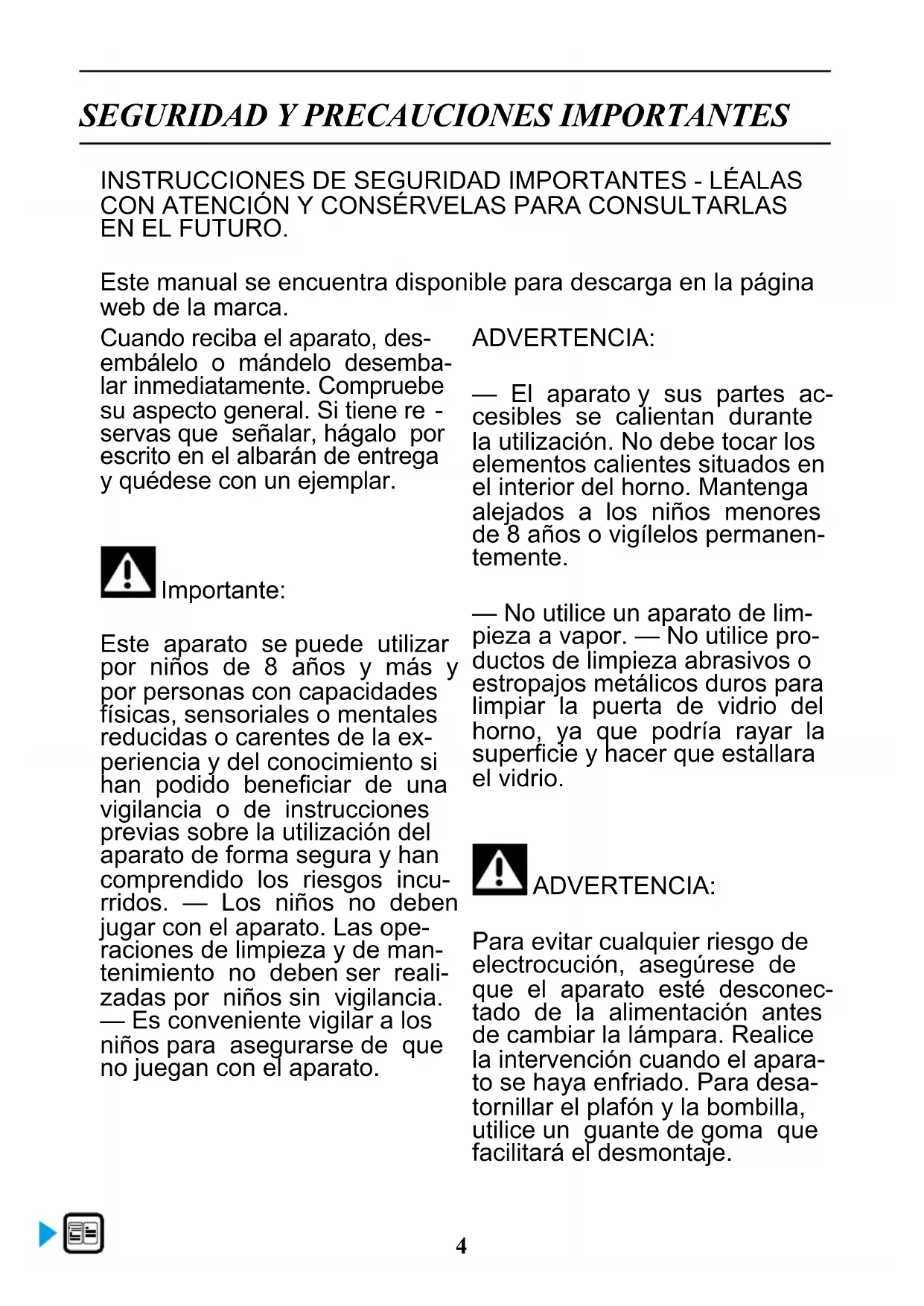 Este aparato se pueda utiliser por niños de 8 años y más y por personas con capacities físicas, sensoriales o mentales reduidas o carentes de la experiencia y del conocimiento si han podido beneficiar de una vigilancia o de instrucciones previas sobre la utilización del aparato de forma segura y han comprehindo los riesgos incu-rridos. — Los niños no deben hacer con el aparato. Las operaciones de limpieza y de mantenimiento no deben ser realizadas por niños sin vigilancia. — Es conveniente vigilar a los niños para asegurar de que no jugan con el aparato.