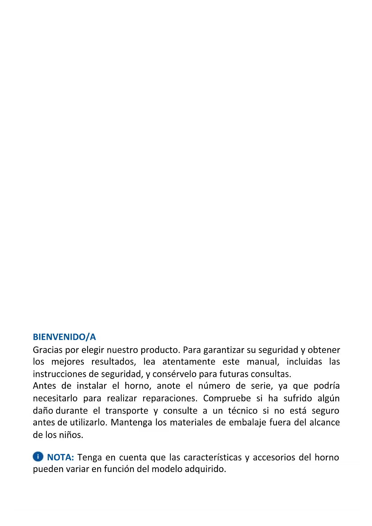 ODER Stoßfänger Stoßfänger mmBIENVENIDO/A Gracias por elegir nuestro producto. Para garantizar su seguridad y obtener los mejores resultados, lea atentamente este manual, incluidas las instrucciones de seguridad, y consérvelo para futuras consultas. Antes de instalar el horno, anote el número de serie, ya que podría necesitarlo para realizar reparaciones. Compruebe si ha sufrido algún daño durante el transporte y consulte a un técnico si no está seguro antes de utilizarlo. Mantenga los materiales de embalaje fuera del alcance de los niños. NOTA: Tenga en cuenta que las características y accesorios del horno pueden variar en función del modelo adquirido.ÍNDICE