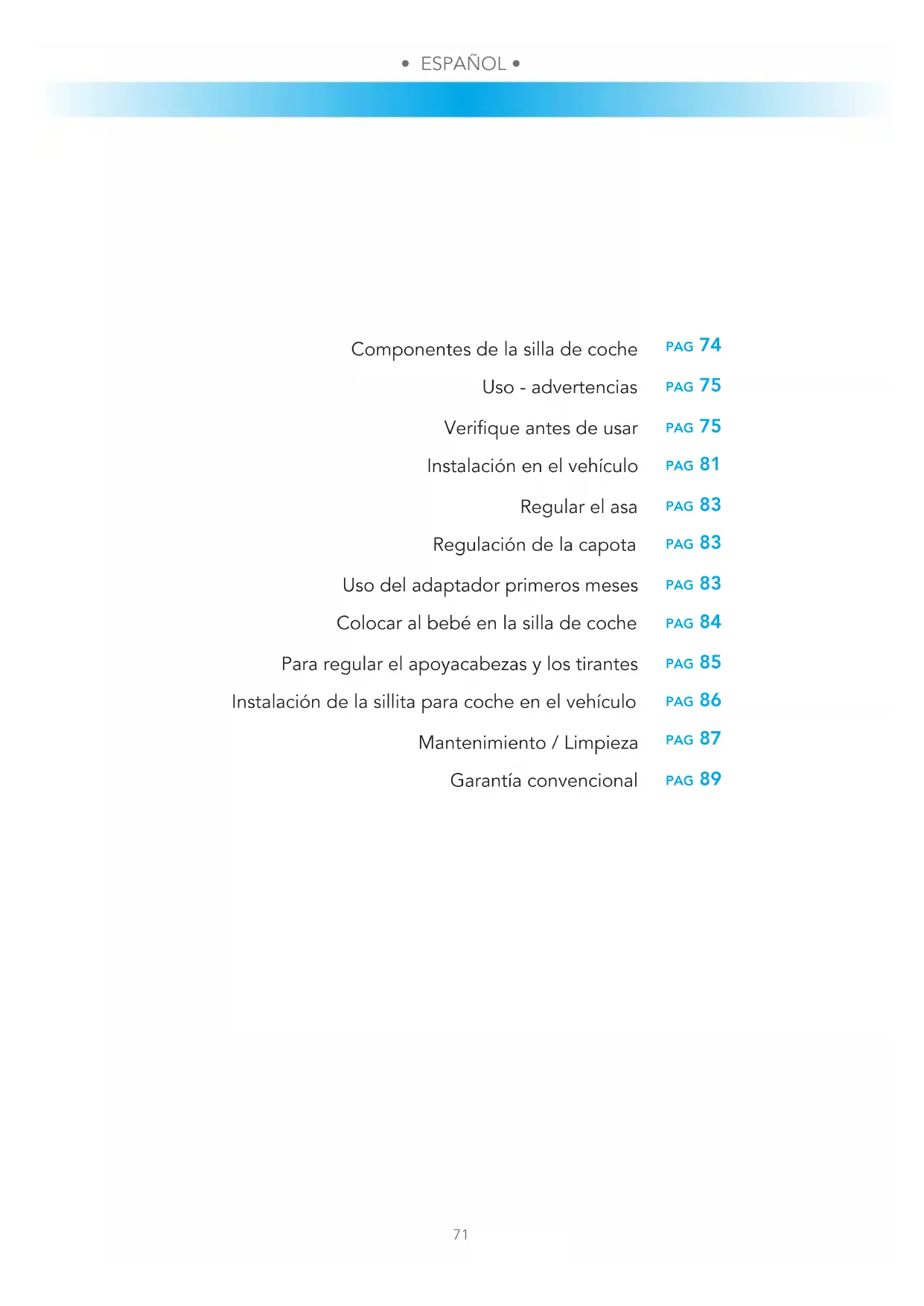 pag 74 pag 75 pag 75 pag 81 pag 83 pag 83 pag 83 pag 84 pag 85 pag 86 pag 87 pag 89 Componentes de la silla de coche Uso - advertencias Verique antes de usar Instalación en el vehículo Regular el asa Regulación de la capota Uso del adaptador primeros meses Colocar al bebé en la silla de coche Para regular el apoyacabezas y los tirantes Instalación de la sillita para coche en el vehículo Mantenimiento / Limpieza Garantía convencional• ESPAÑOL • • ESPAÑOL •