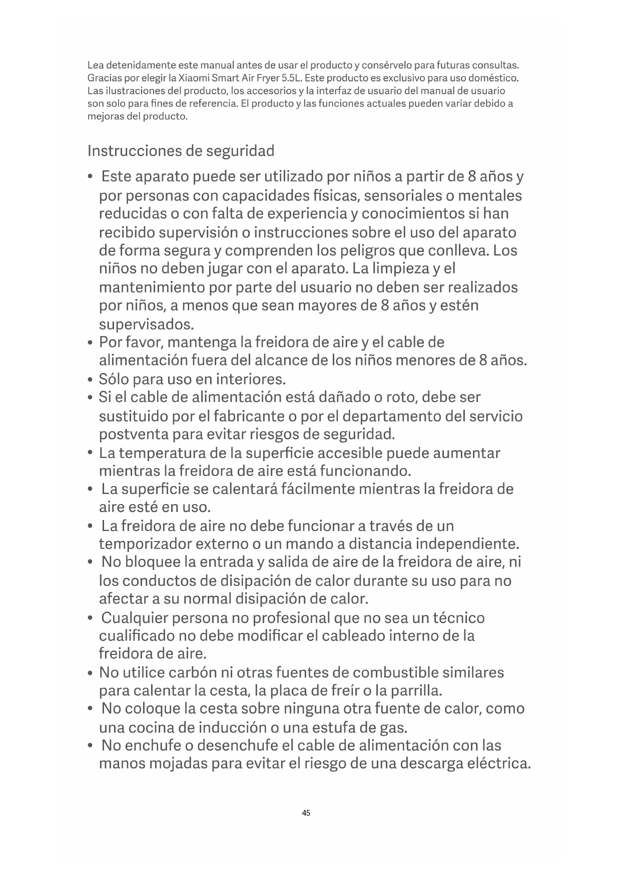 TRI45 Lea detenidamente este manual antes de usar el producto y consérvelo para futuras consultas. Gracias por elegir la Xiaomi Smart Air Fryer 5.5L. Este producto es exclusivo para uso doméstico. Las ilustraciones del producto, los accesorios y la interfaz de usuario del manual de usuario son solo para fines de referencia. El producto y las funciones actuales pueden variar debido a mejoras del producto. Instrucciones de seguridad